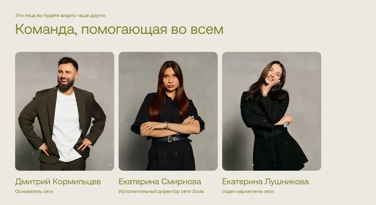 Секция «Команда» с сайта https://sodanails.ru/, тематика — Красота, цвета — Белый, Черный, Серый, стиль — Корпоративный, Минимализм, типографика — Без засечек