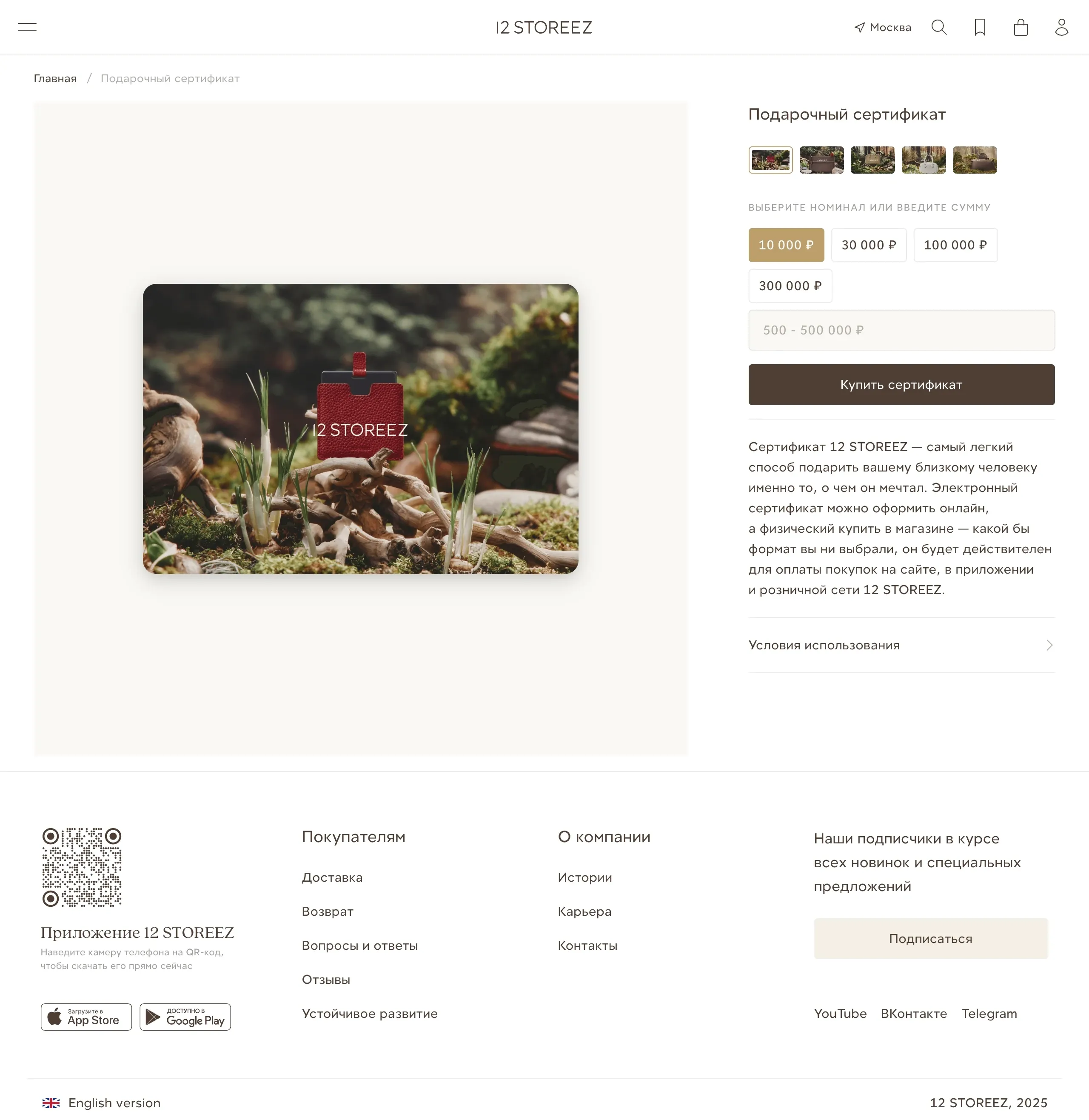 Интернет-магазин, предлагающий подарочные сертификаты и широкий ассортимент товаров, включая информацию о доставке, возврате и истории бренда.