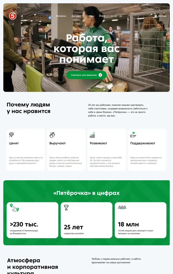 Страница карьеры Пятёрочка, тематика — Розничная торговля, цвета — Белый, Серый, Зеленый, стиль — Корпоративный, типографика — Без засечек