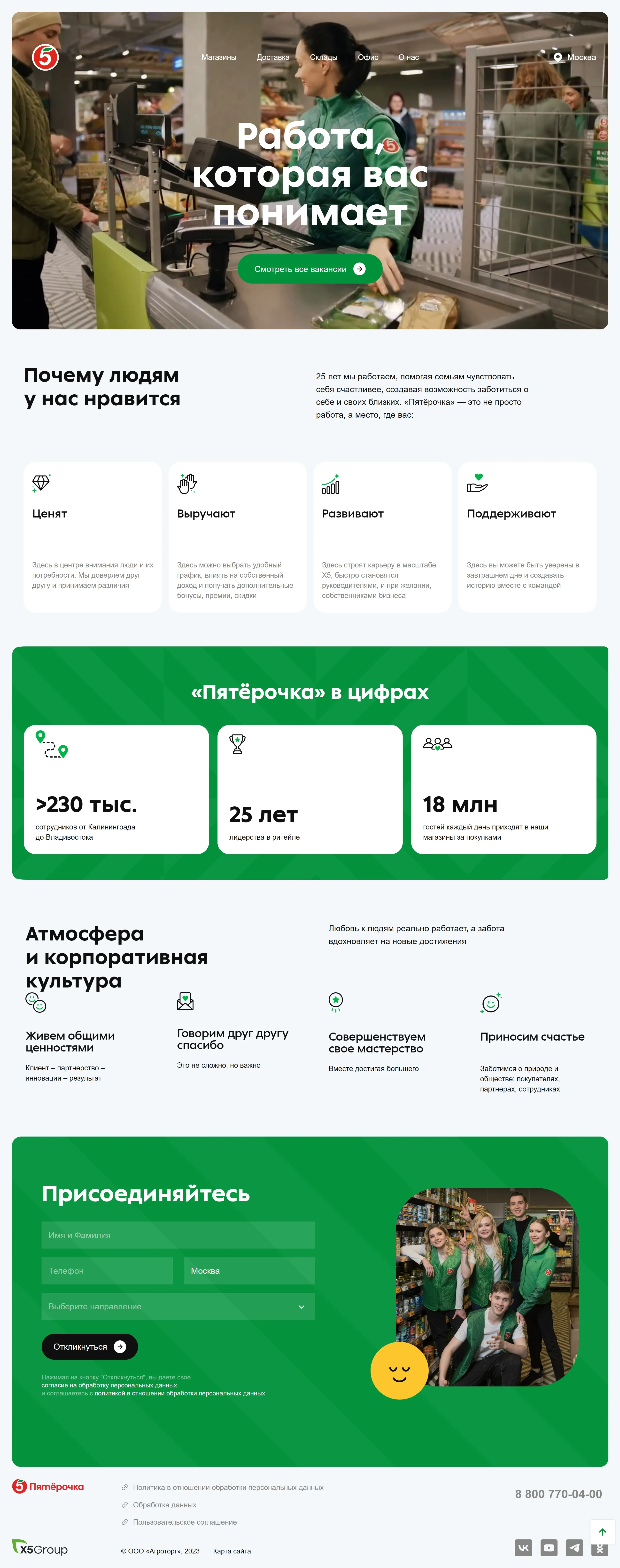 Страница карьеры Пятёрочка, тематика — Розничная торговля, цвета — Белый, Серый, Зеленый, стиль — Корпоративный, типографика — Без засечек