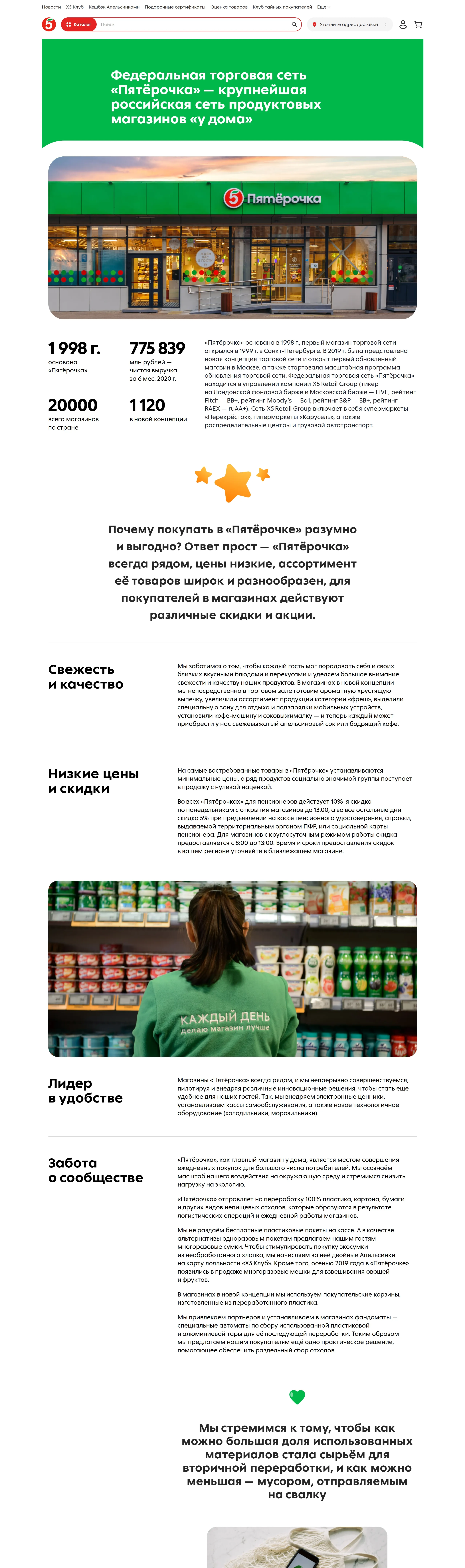 Страница о компании Пятёрочка, тематика — Розничная торговля, цвета — Белый, стиль — Корпоративный, типографика — Без засечек