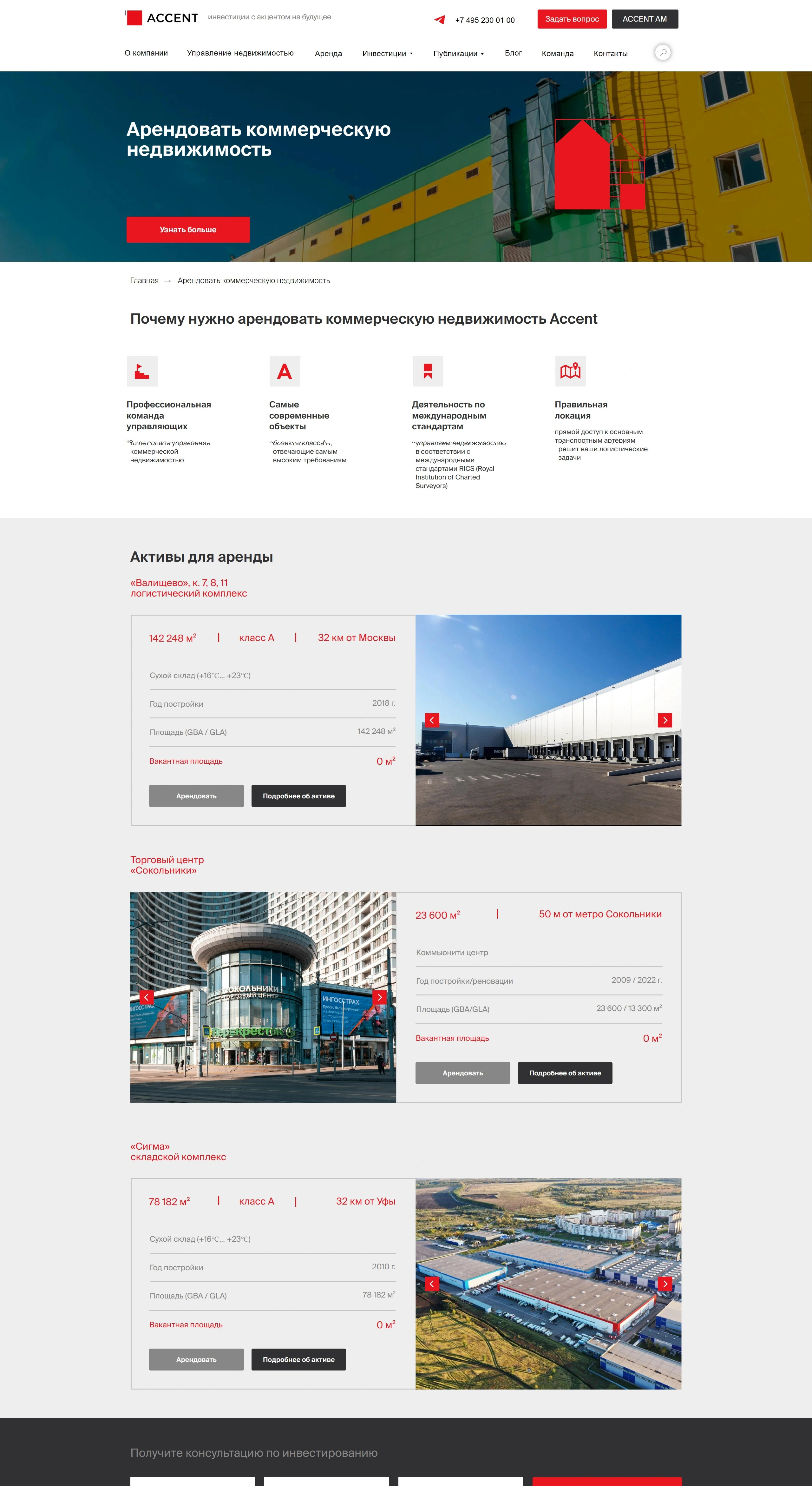 Компания предлагает услуги управления инвестициями в жилую и коммерческую недвижимость, включая складскую, офисную и торговую.