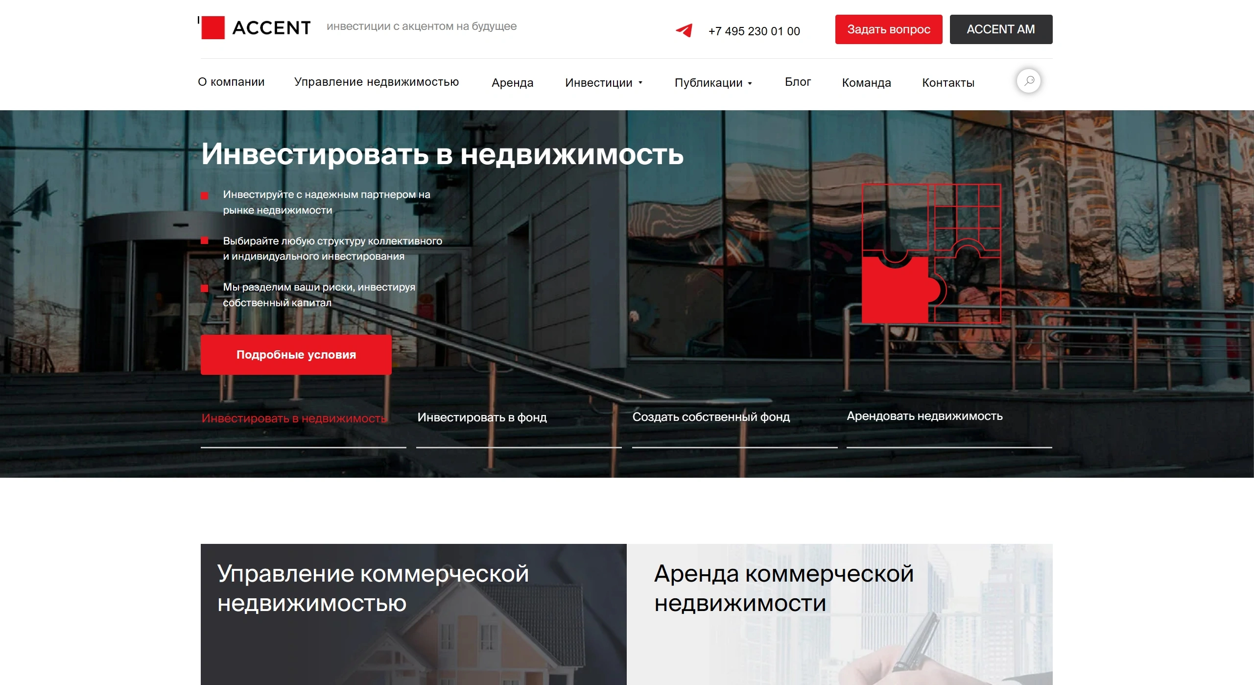 Компания предлагает услуги управления инвестициями в жилую и коммерческую недвижимость, включая складскую, офисную и торговую.