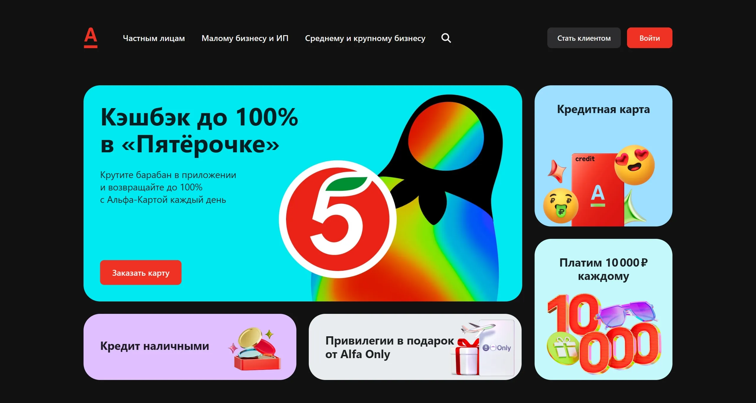 Секция «Призыв к действию» с сайта https://alfabank.ru/, тематика — Финансы, цвета — Белый, стиль — Фестивальный, типографика — Без засечек