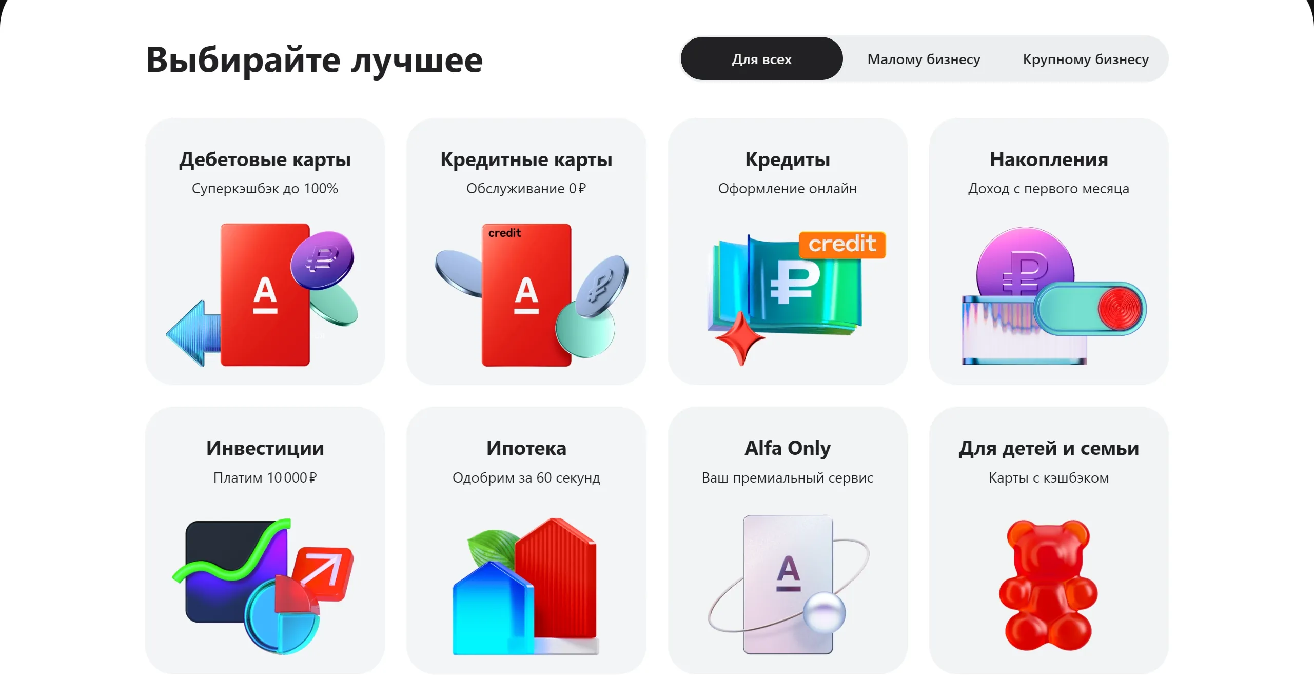 Секция «Услуги» с сайта https://alfabank.ru/, тематика — Финансы, цвета — Белый, стиль — Корпоративный, типографика — Без засечек