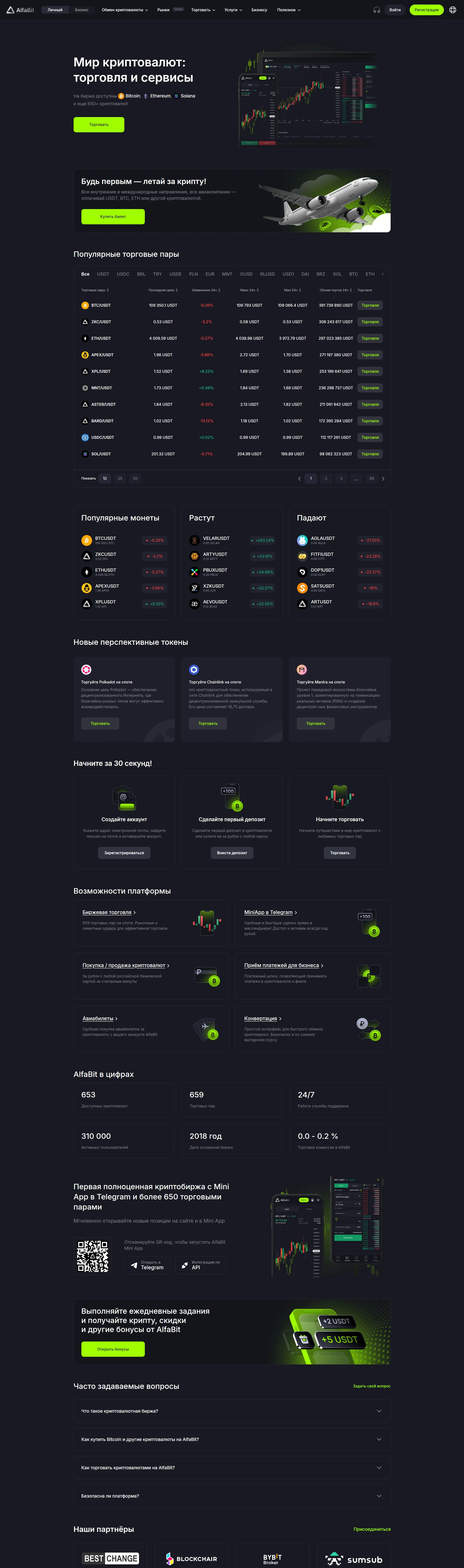 Главная alfabit, тематика — Крипто  и блокчейн, цвета — Черный, стиль — Корпоративный, типографика — Без засечек