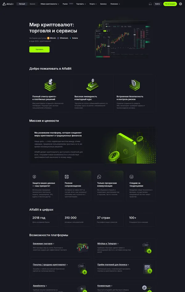 Страница о компании alfabit, тематика — Крипто  и блокчейн, цвета — Черный, стиль — Корпоративный, типографика — Без засечек