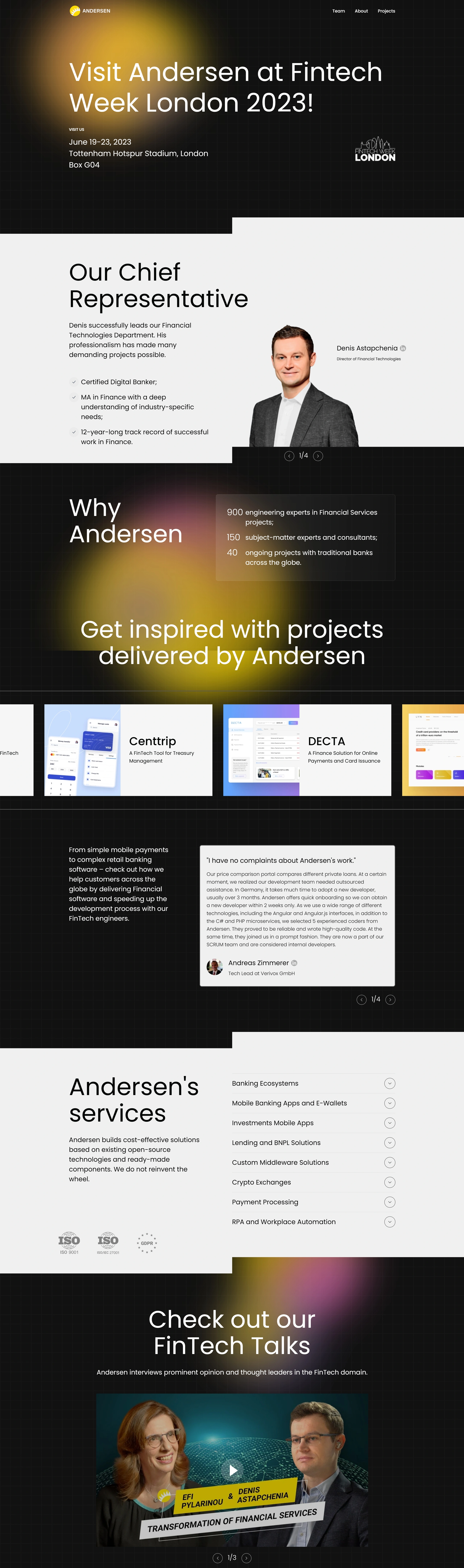 Andersen is participating in Fintech Week London 2023, connecting finance, technology, and government through a series of meetings and discussions. The company boasts a team of 900 engineering experts and 150 consultants focused on Financial Services projects.