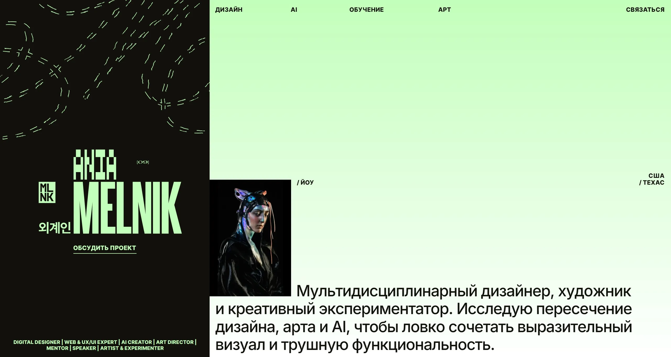Мультидисциплинарный дизайнер и арт-директор, специализирующийся на дизайне, UX/UI и искусственном интеллекте. Она исследует пересечение дизайна и арта, создавая уникальные визуальные решения, которые гармонично сочетают форму и функциональность.