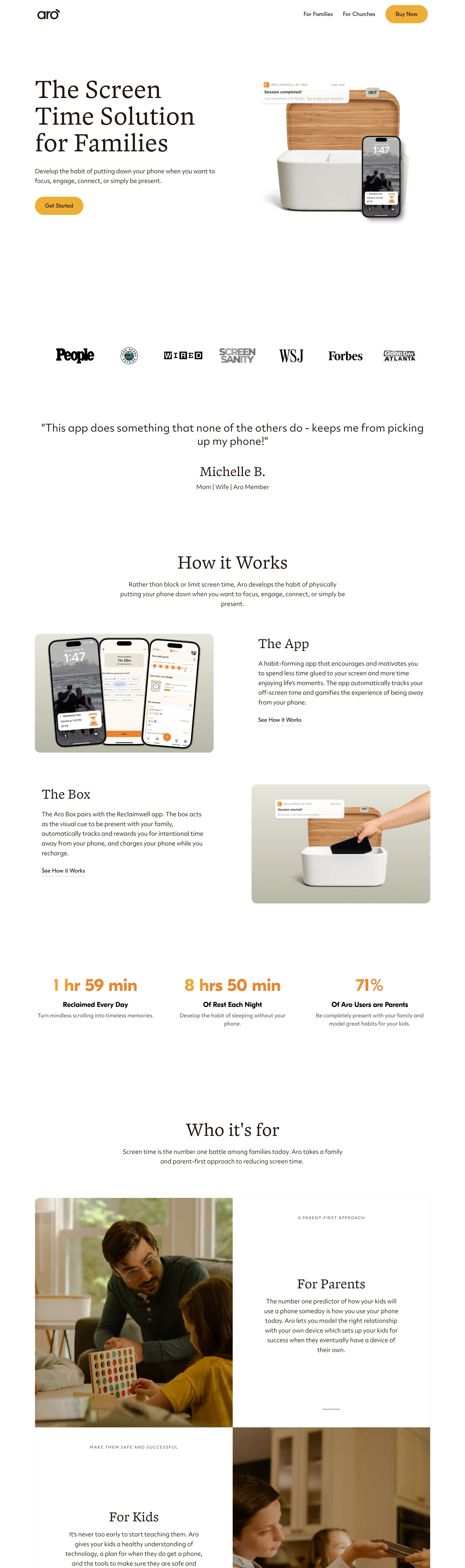 Это решение для контроля экранного времени, предлагающее приложение и зарядную станцию, помогающие пользователям сократить время, проведенное за экранами, и сосредоточиться на реальной жизни.