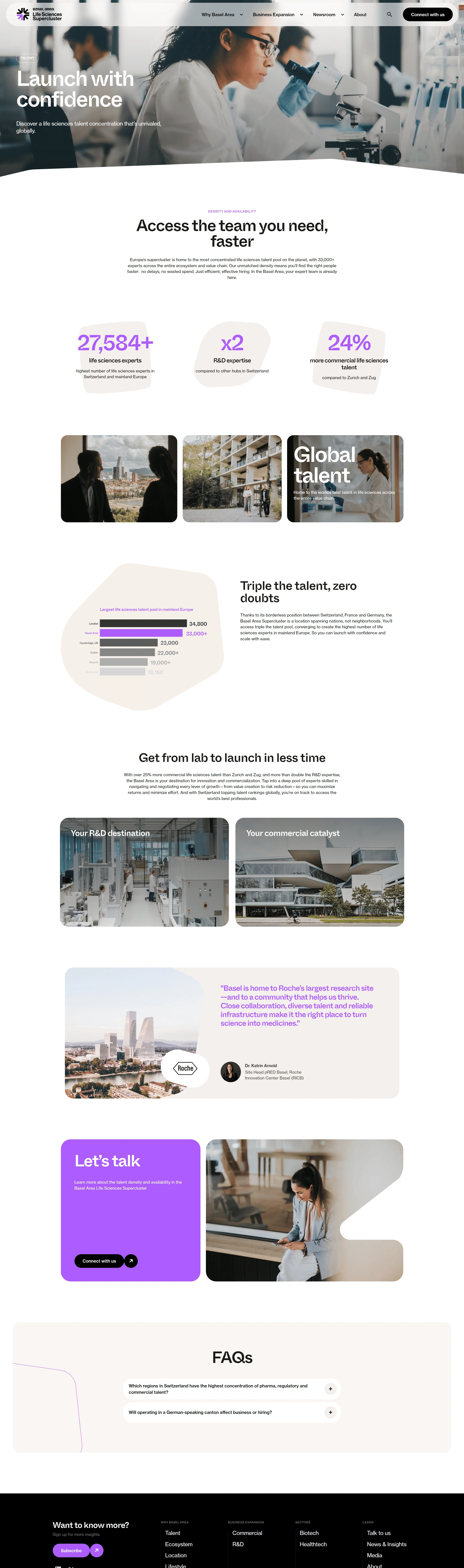 The Basel Area serves as Europe's leading life sciences supercluster, where research and innovation thrive alongside a dense ecosystem of companies and talent. It offers unmatched access to the largest pool of life sciences professionals in mainland Europe.