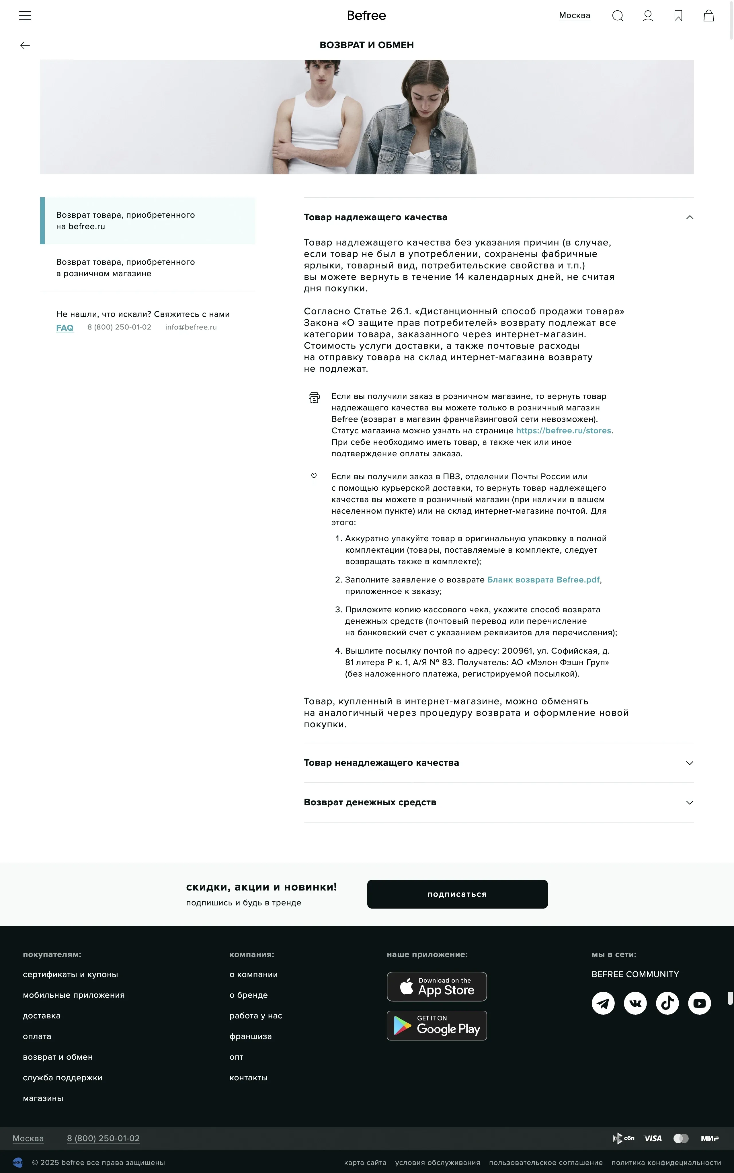 Интернет-магазин предлагает условия возврата и обмена товаров, позволяя клиентам возвращать товары надлежащего качества в течение 14 дней.