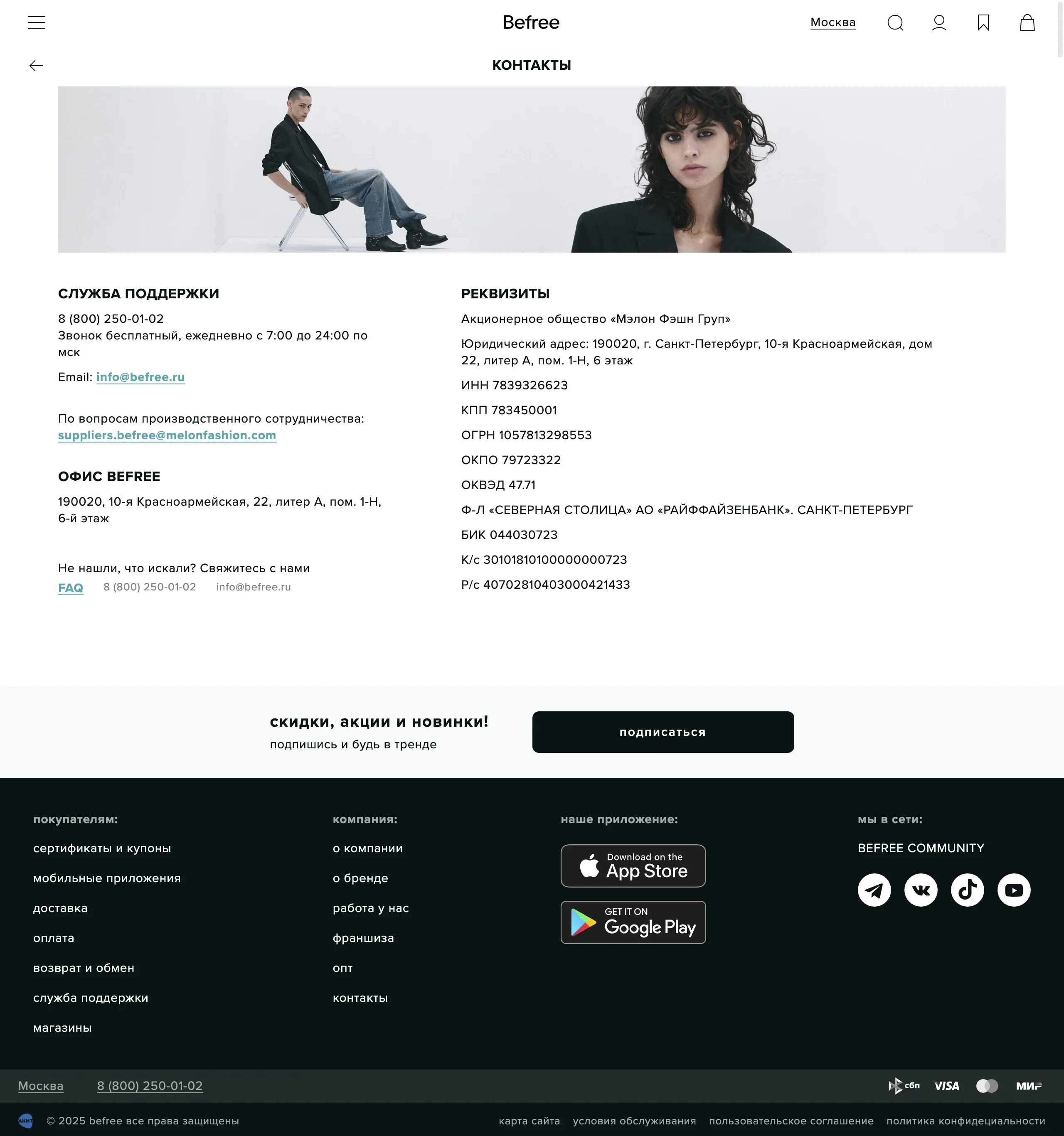 Интернет-магазин предлагает разнообразные товары, управляемые компанией Мэлон Фэшн Групп, включая поддержку для клиентов и контактные данные для сотрудничества.