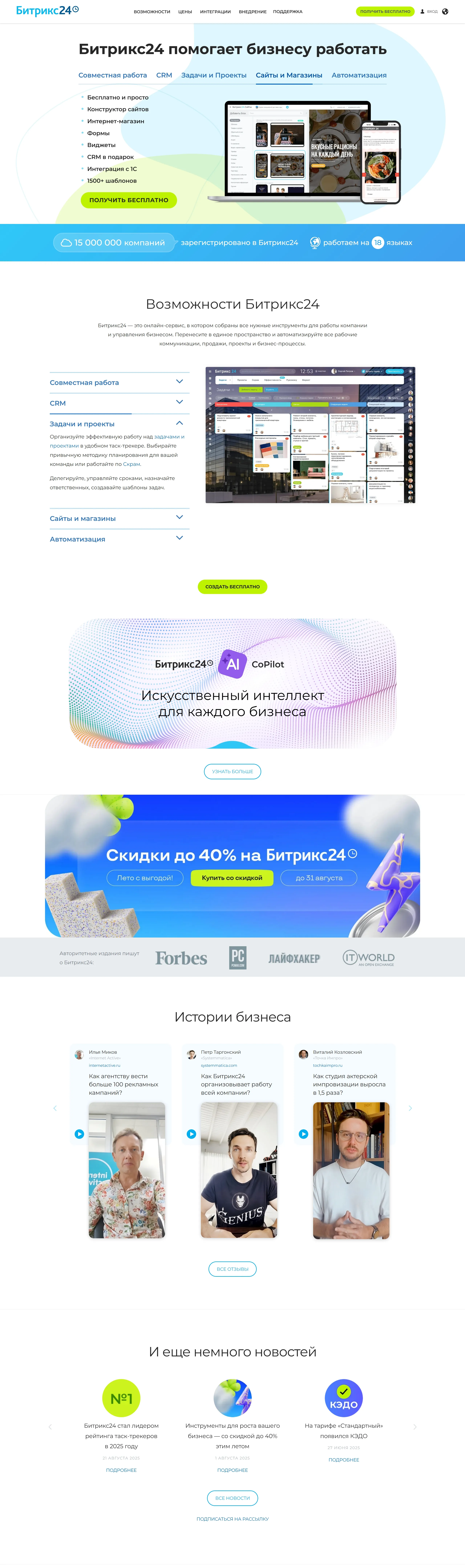 Полный комплект бесплатных инструментов для ведения бизнеса, включая CRM, конструктор сайтов, систему управления проектами и контакт-центр.