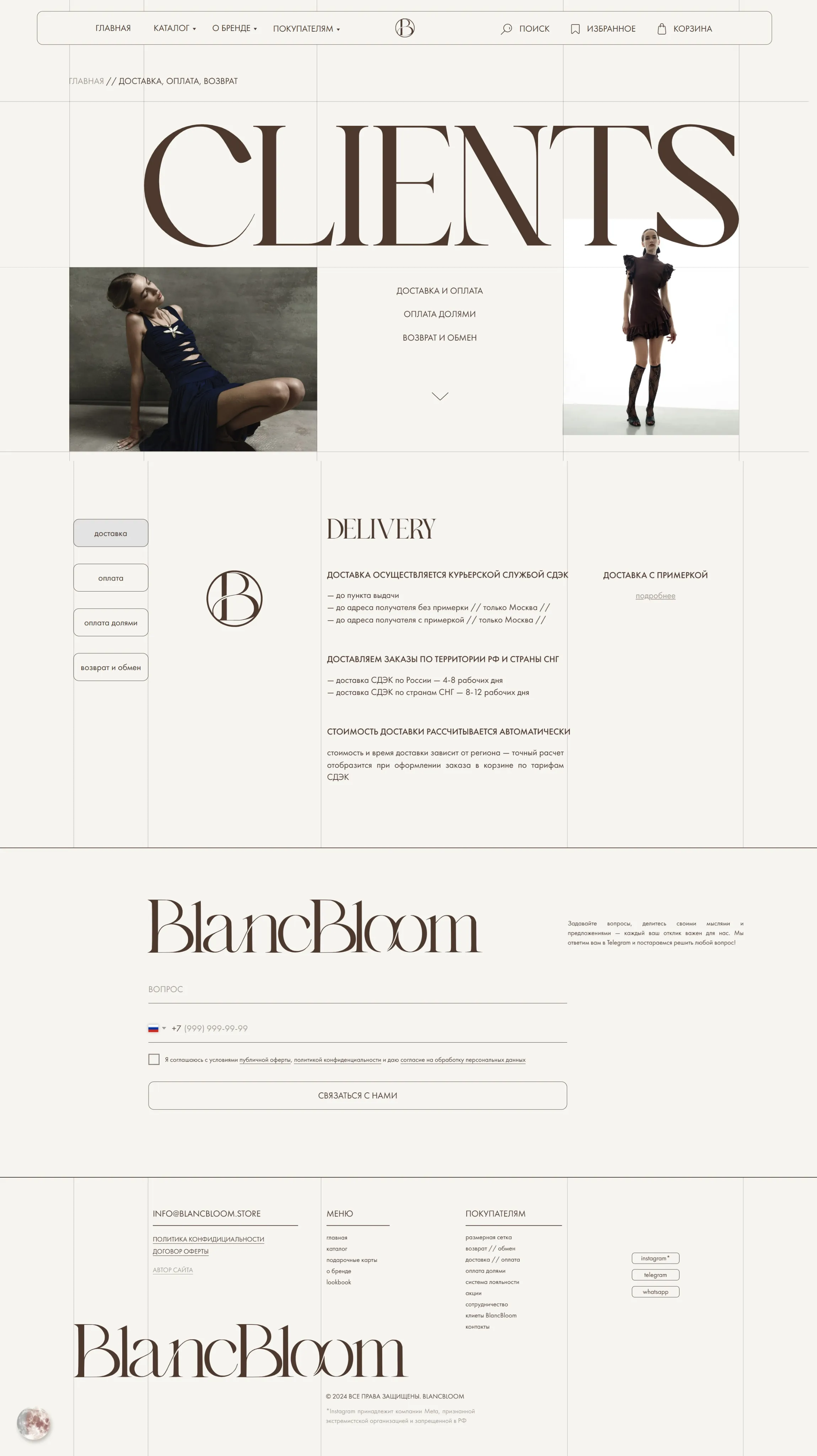 Компания предлагает услуги доставки и оплаты, включая возможность разделения платежа на 4 части. Также доступны возвраты и обмен товаров в течение 14 дней после получения заказа.