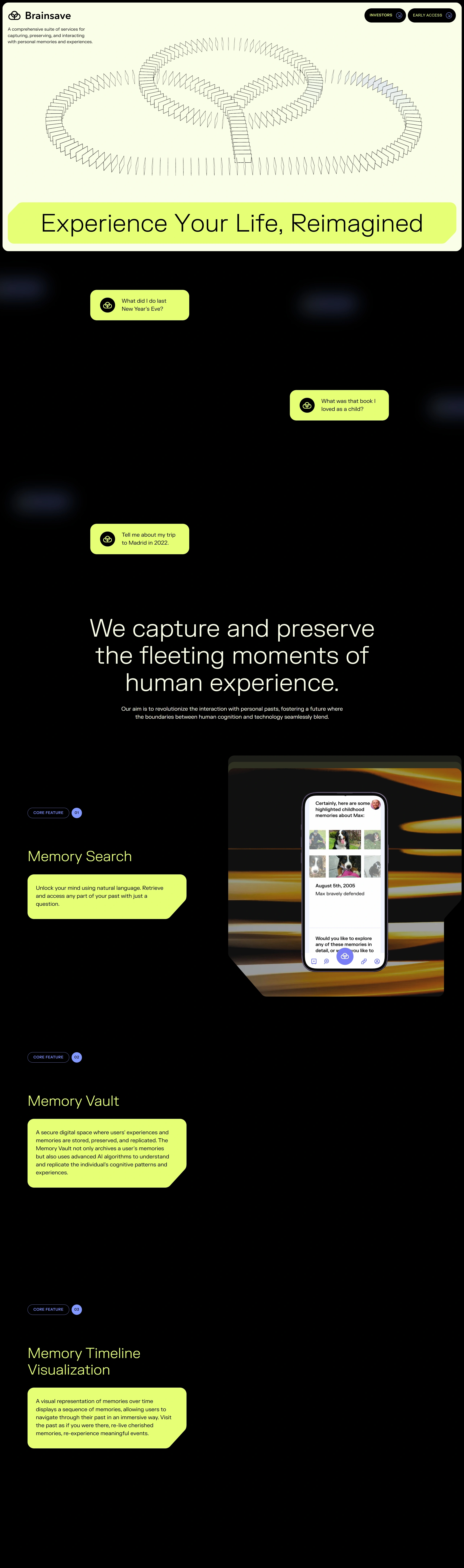 Компания предлагает комплекс услуг по захвату, сохранению и взаимодействию с личными воспоминаниями и переживаниями, стремясь революционизировать общение с личным прошлым.