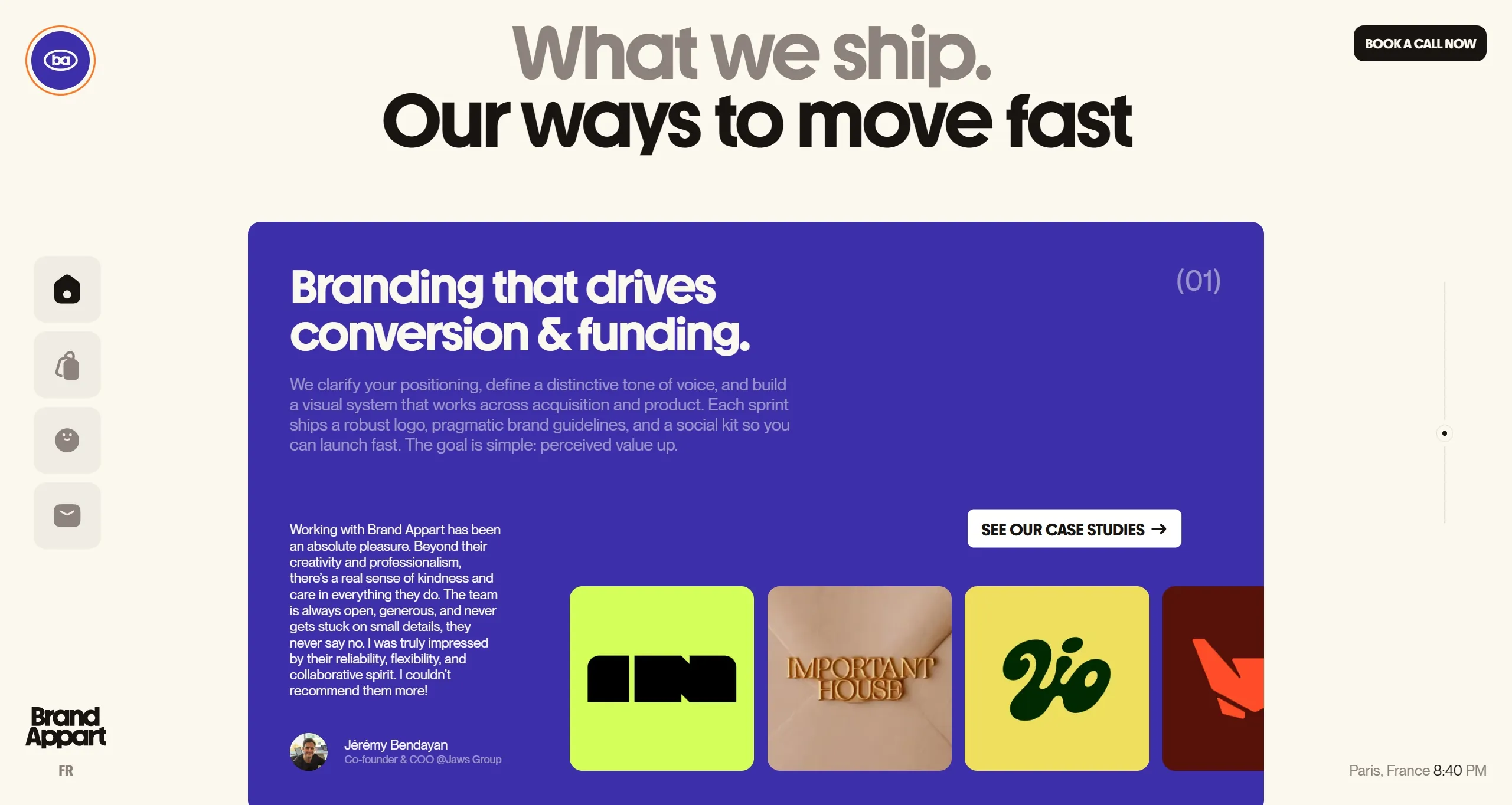 Это дизайн-студия, помогающая стартапам и компаниям среднего размера выделяться с помощью яркого брендинга, умного UX/UI и высокоэффективных цифровых продуктов. Они создают инновационные и целеустремленные дизайны, которые не только привлекают внимание, но и способствуют значительным результатам.