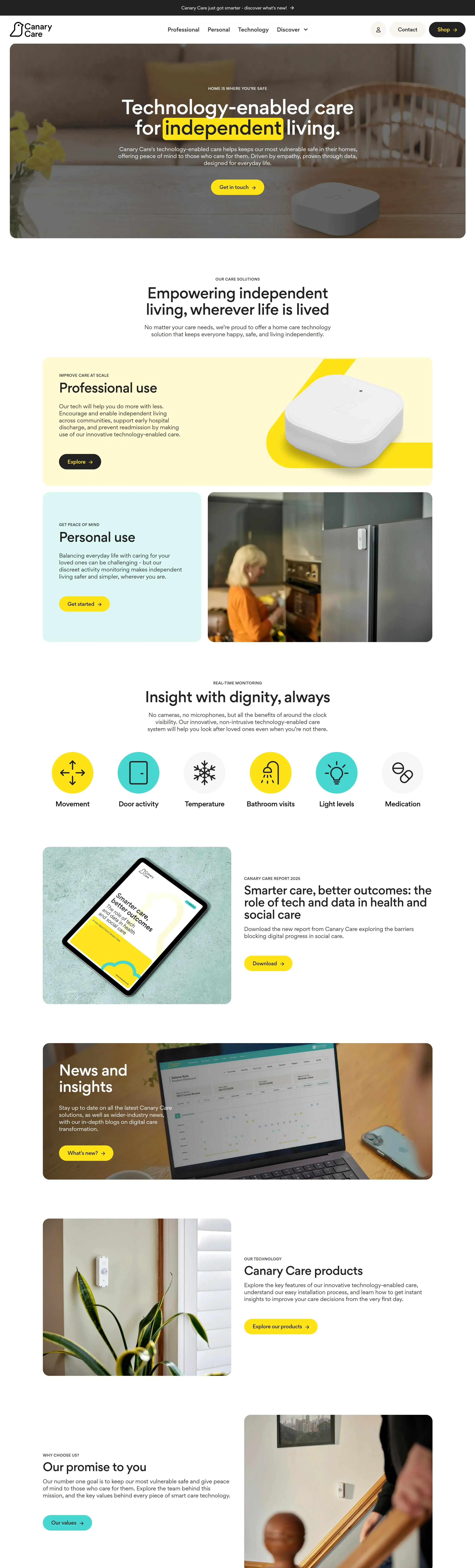 Компания предлагает решения для ухода на основе технологий, способствующие независимой жизни, с помощью дискретных датчиков и круглосуточного мониторинга, обеспечивая безопасность уязвимых людей дома.