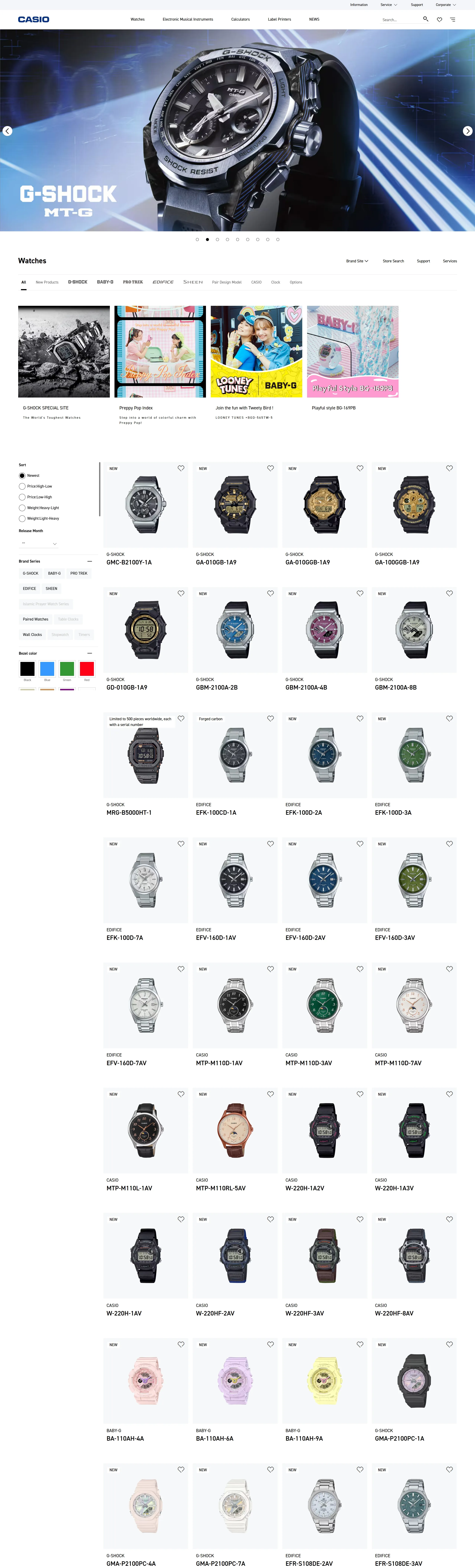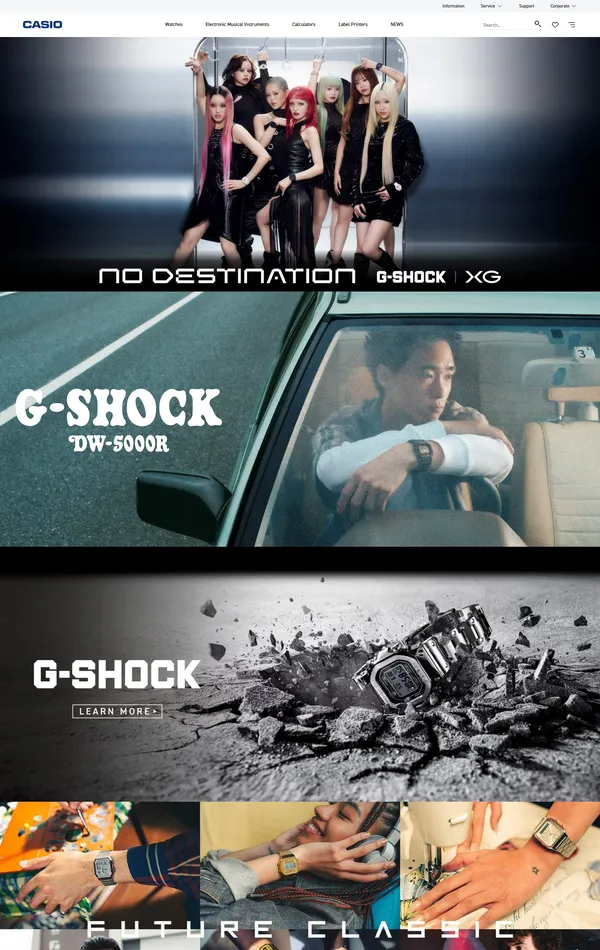 Секция «Призыв к действию» с сайта https://www.casio.com/intl/, тематика — Продукт, цвета — Белый, Черный, Серый, стиль — Корпоративный, Фестивальный, типографика — Без засечек