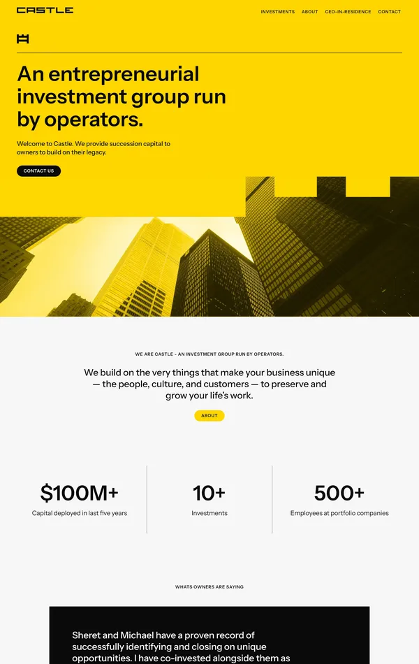 Castle — это инвестиционная группа, управляемая операторами, которая предоставляет капитал для преемственности владельцам, чтобы сохранить и развить их наследие. Они фокусируются на уникальных аспектах бизнеса, таких как люди, культура и клиенты.