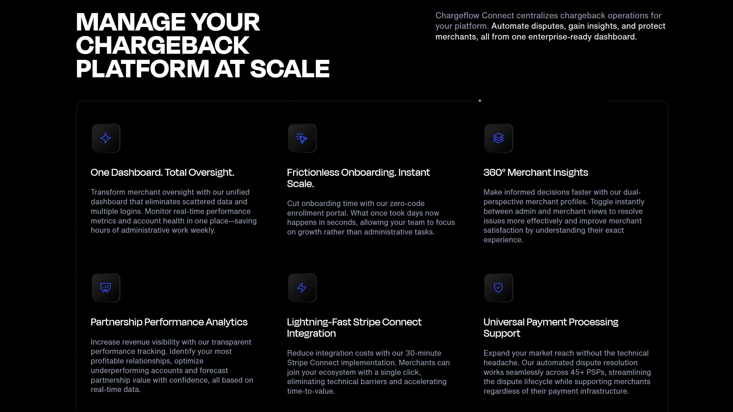 Chargeflow Connect предлагает автоматизированные решения для управления чардбэками, специально разработанные для платежных платформ, ISOs и поставщиков услуг по борьбе с мошенничеством. Платформа использует искусственный интеллект и позволяет интегрировать функции управления чардбэками в другие инструменты.