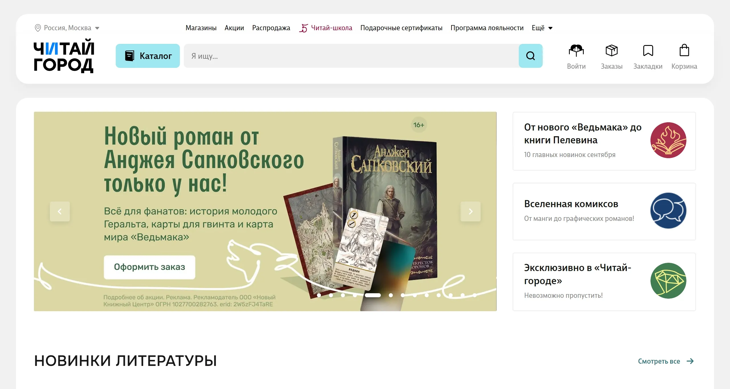 Секция «Первый экран» с сайта https://www.chitai-gorod.ru/, тематика — Интернет-магазин, цвета — Белый, Серый, Желтый, стиль — Корпоративный, типографика — Без засечек