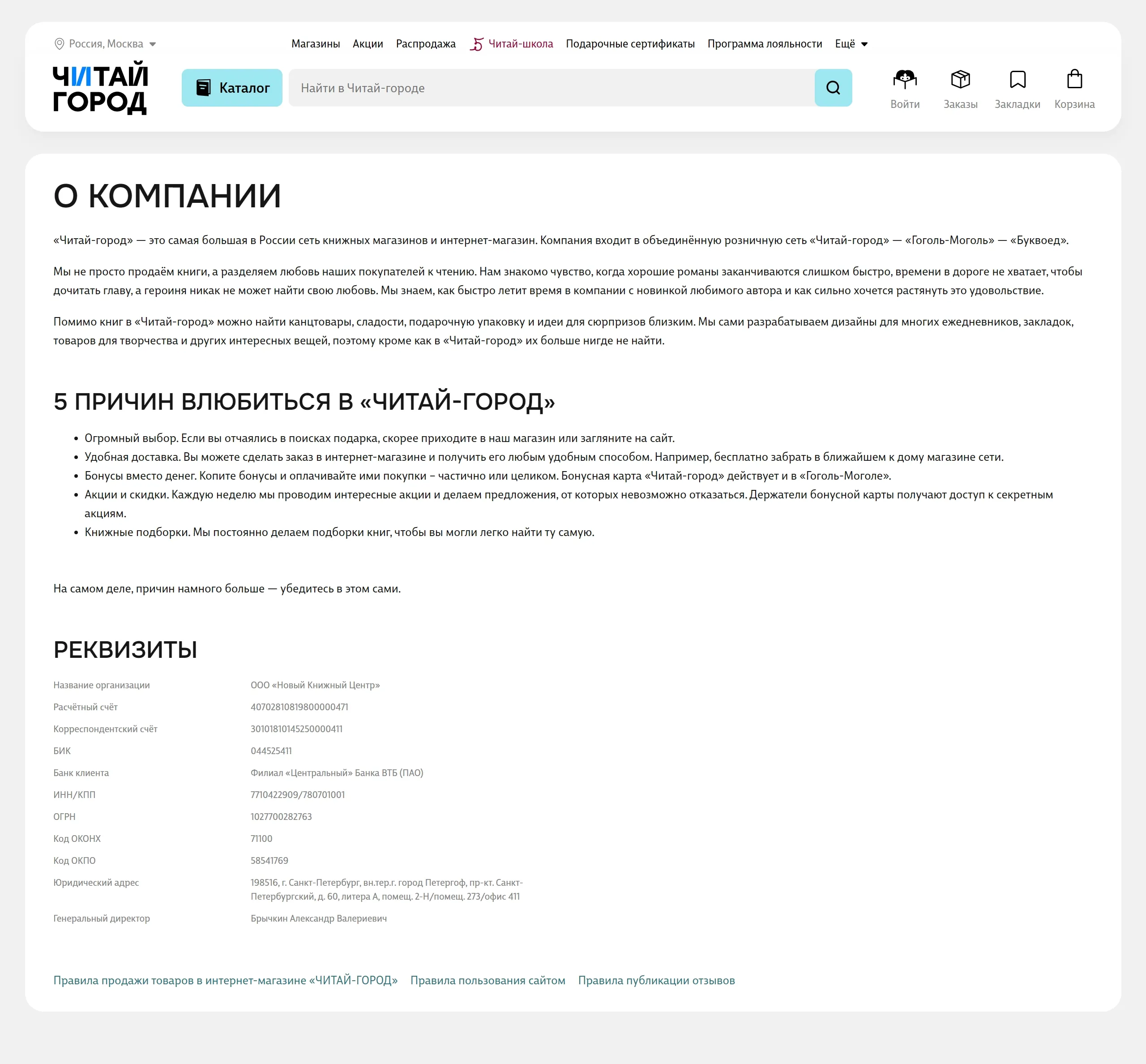 Секция «О компании» с сайта https://www.chitai-gorod.ru/, тематика — Интернет-магазин, цвета — Белый, стиль — Корпоративный, Минимализм, типографика — Без засечек