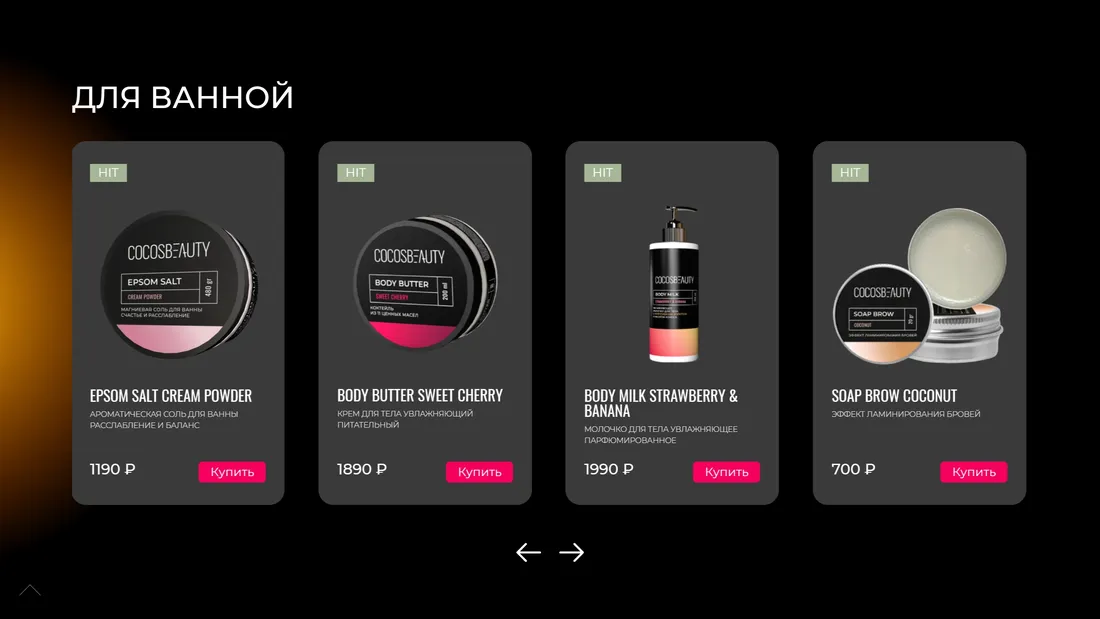 Компания предлагает широкий ассортимент натуральной косметики для ухода за телом, включающей гели для душа, соли для ванны и масла, с акцентом на увлажнение и расслабление.