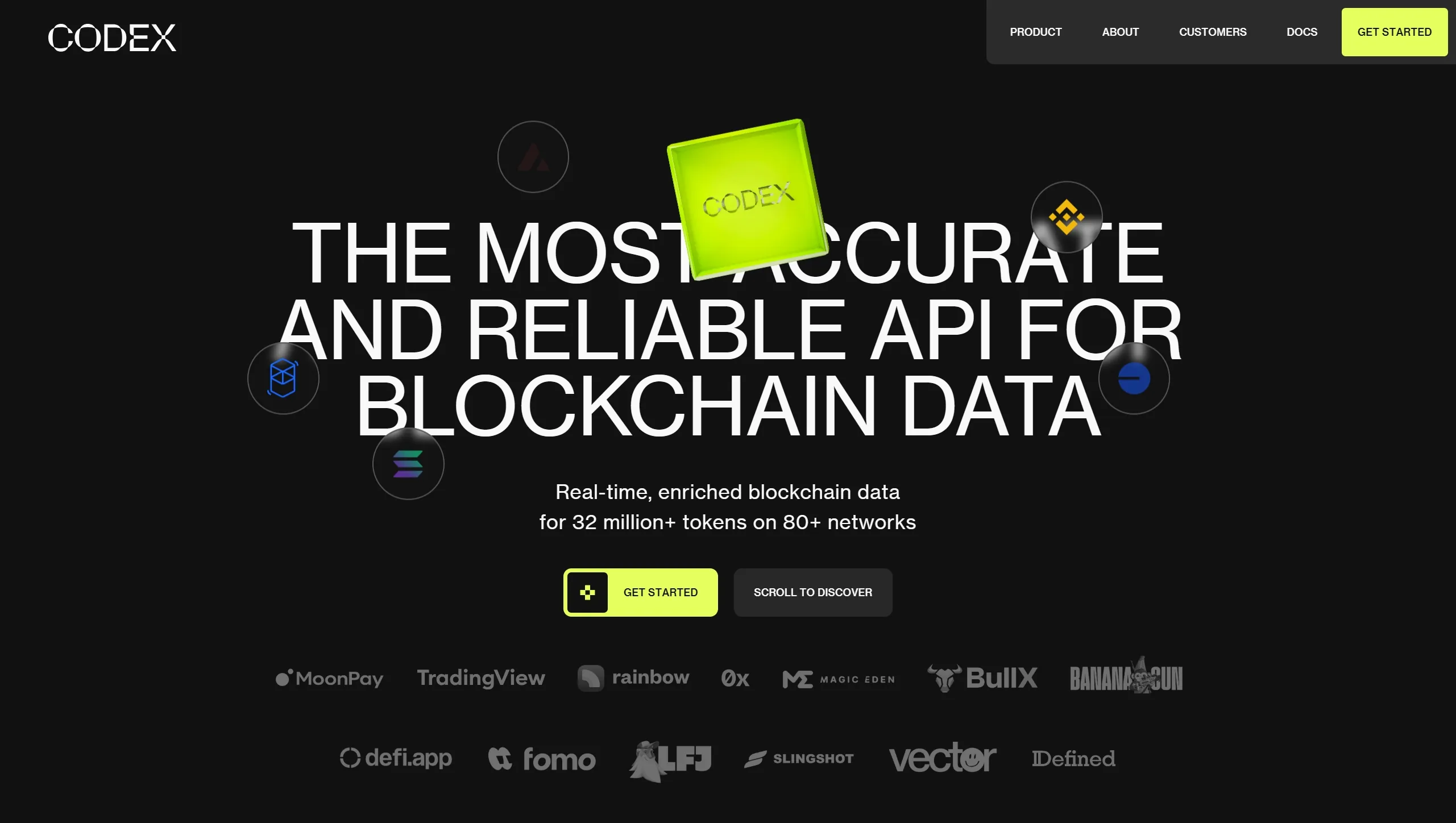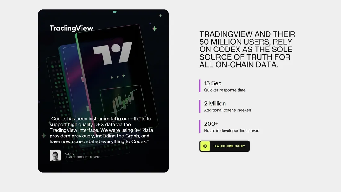 Codex предлагает API, который обеспечивает реальное, обогащенное blockchain-данные для более чем 4.5 миллионов токенов и 1 миллиарда NFT на 57 сетях, позволяя пользователям сэкономить время и ресурсы на обработке данных.