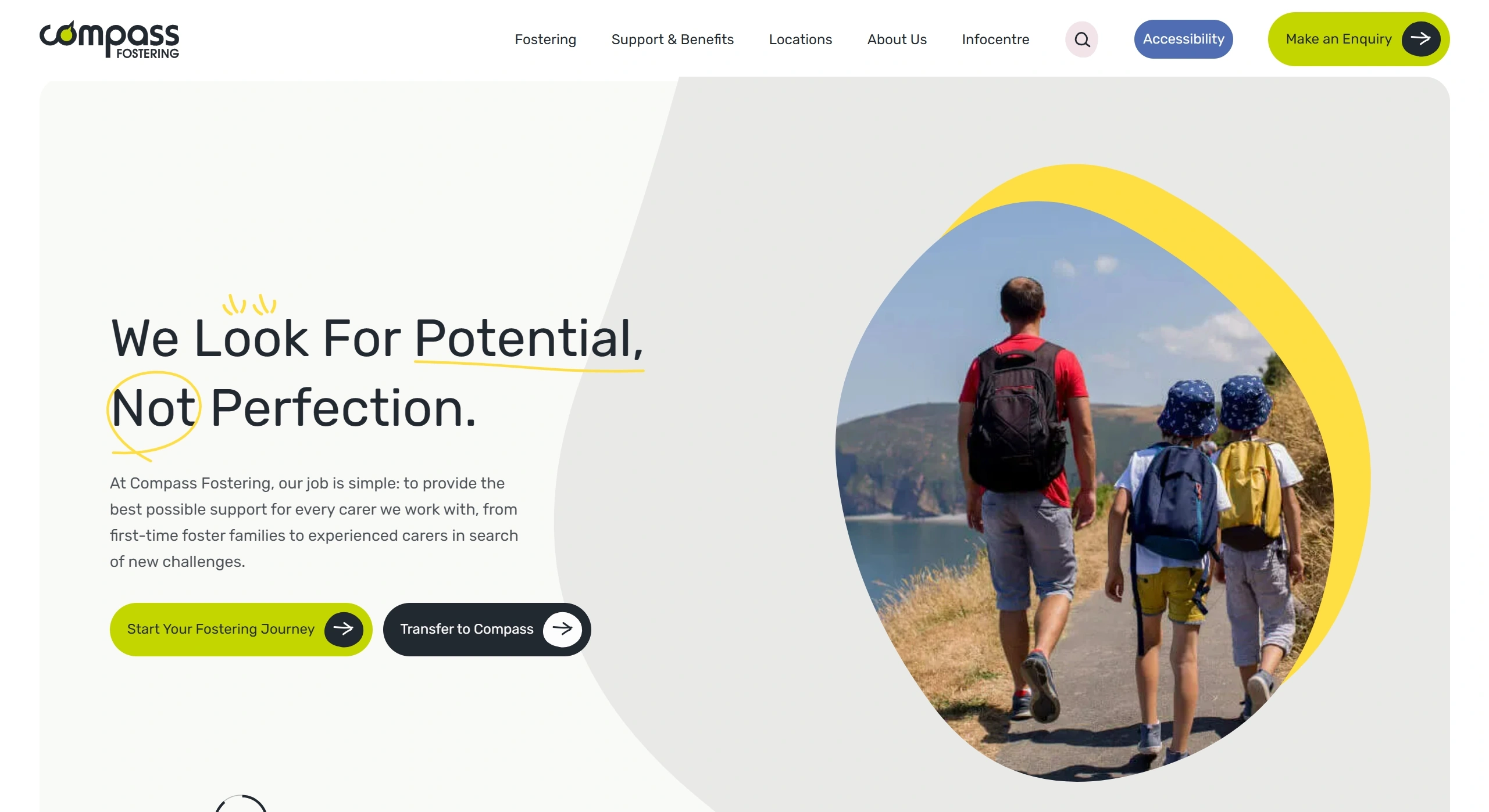 Страница карьеры Compass Fostering, тематика — Некоммерческая деятельность, HR, цвета — Белый, Желтый, стиль — Корпоративный, типографика — Без засечек
