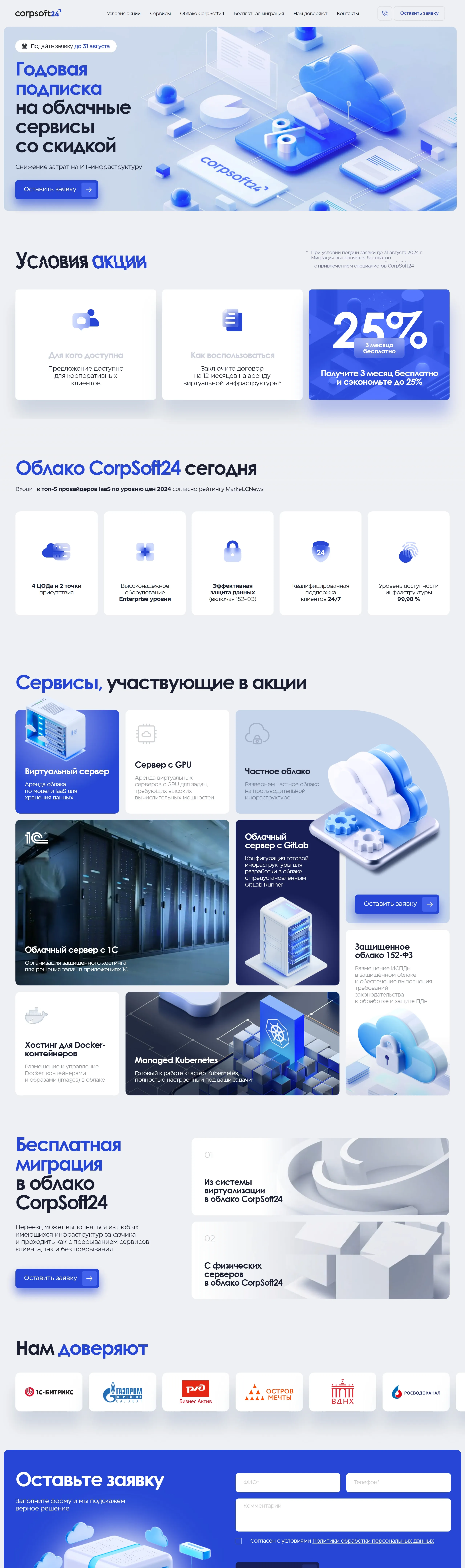Компания предлагает годовую подписку на облачные сервисы со скидкой, помогая снизить затраты на ИТ-инфраструктуру для корпоративных клиентов. Включает бесплатную миграцию и высокое качество услуг.