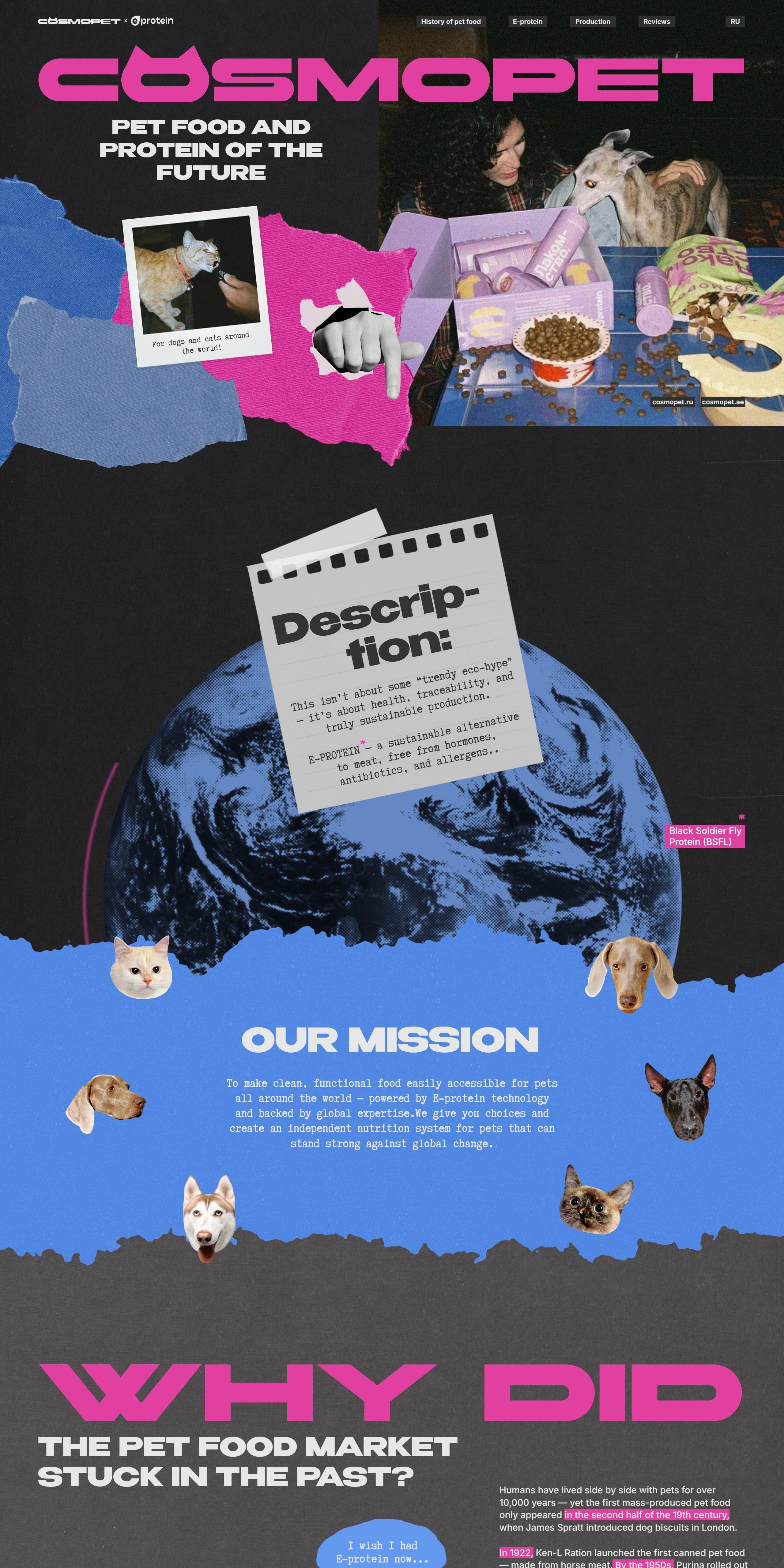 Cosmopet предлагает устойчивый протеин из личинок черной солдатской мухи для питания и угощений для домашних животных, гарантируя отсутствие гормонов и аллергенов, а также доступность и пользу для собак и кошек.