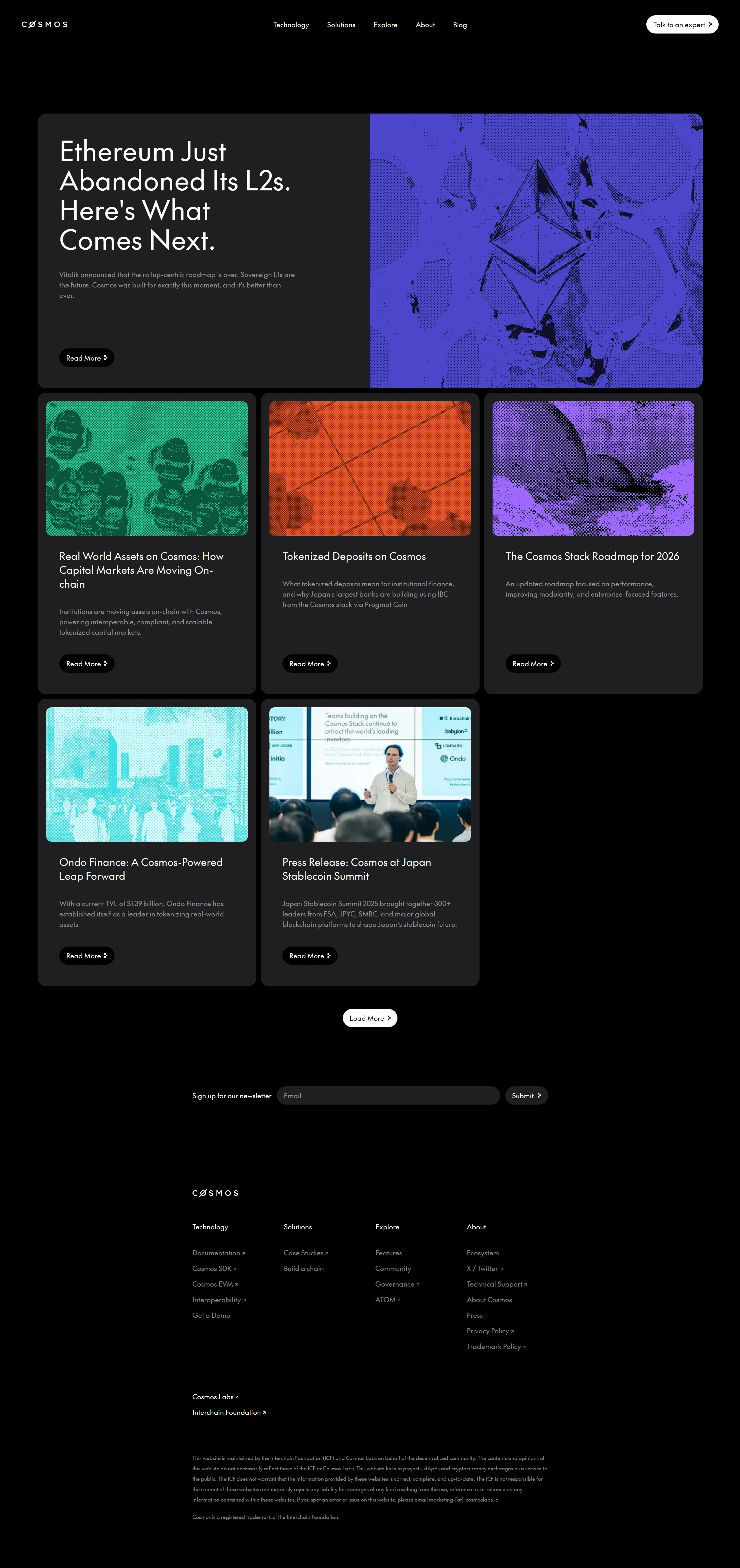 Cosmos is an ever-expanding ecosystem of interoperable and sovereign blockchain apps and services, built for a decentralized future. It is the most widely-adopted blockchain technology stack, powering digital ledgers in finance, government, global enterprise, and Web3.