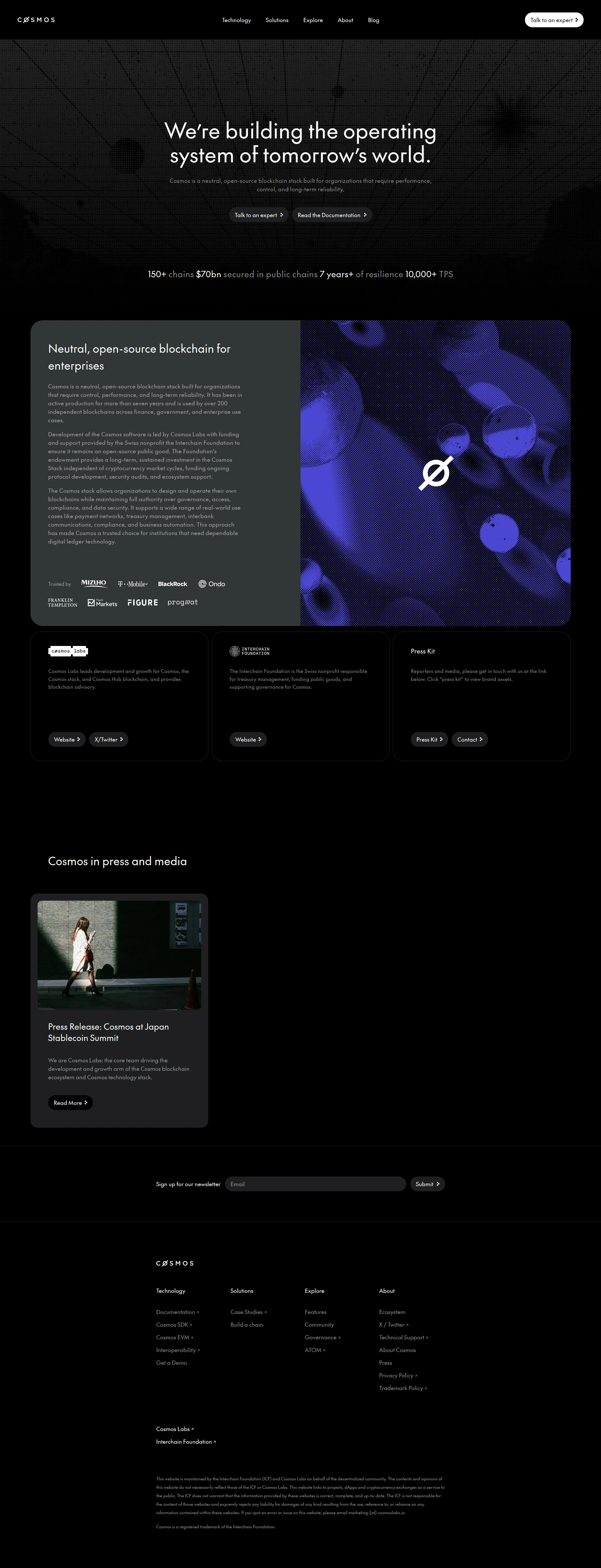 Cosmos is an ever-expanding ecosystem of interoperable and sovereign blockchain apps and services, designed for a decentralized future. It powers digital ledgers across various sectors, including finance and government.