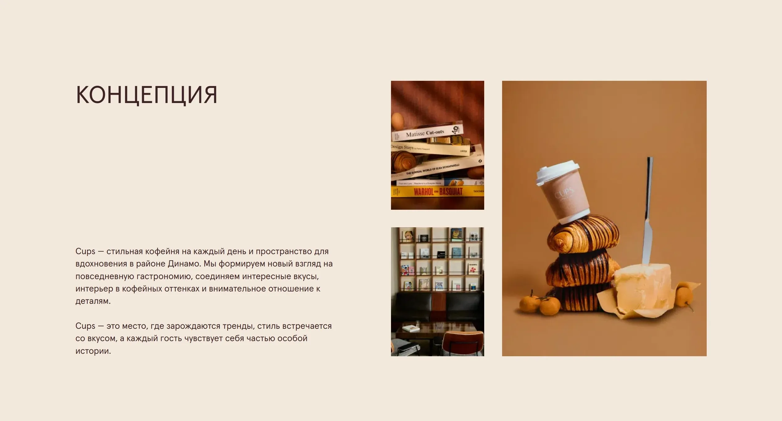 Cups — стильная кофейня в районе Динамо, предлагающая уникальный опыт с акцентом на комфорт-фуд и спешелти-кофе. Здесь гости могут насладиться интересными вкусами и атмосферой, созданной внимательным отношением к деталям.
