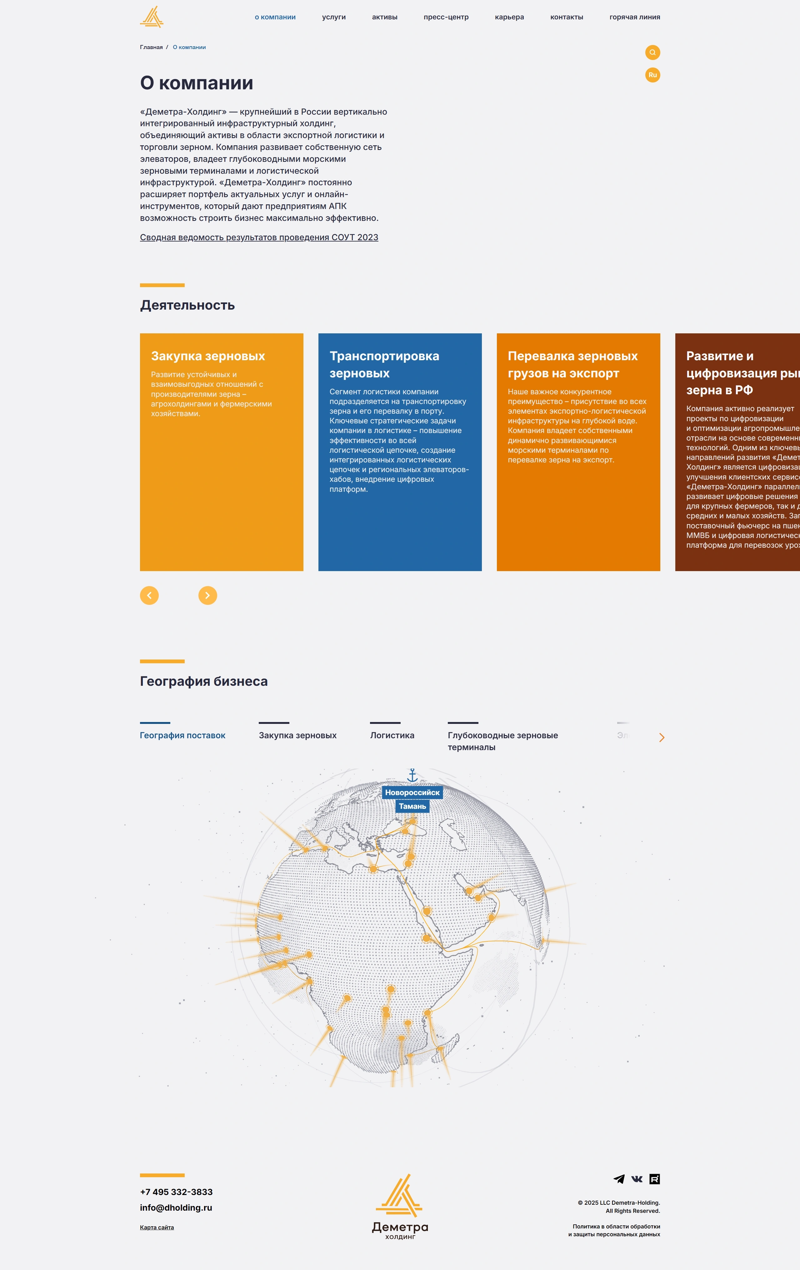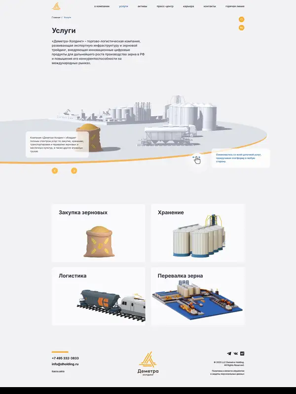 Страница о компании Деметра-Холдинг, тематика — Бизнес и профессиональные услуги, цвета — Белый, стиль — Корпоративный, типографика — Без засечек