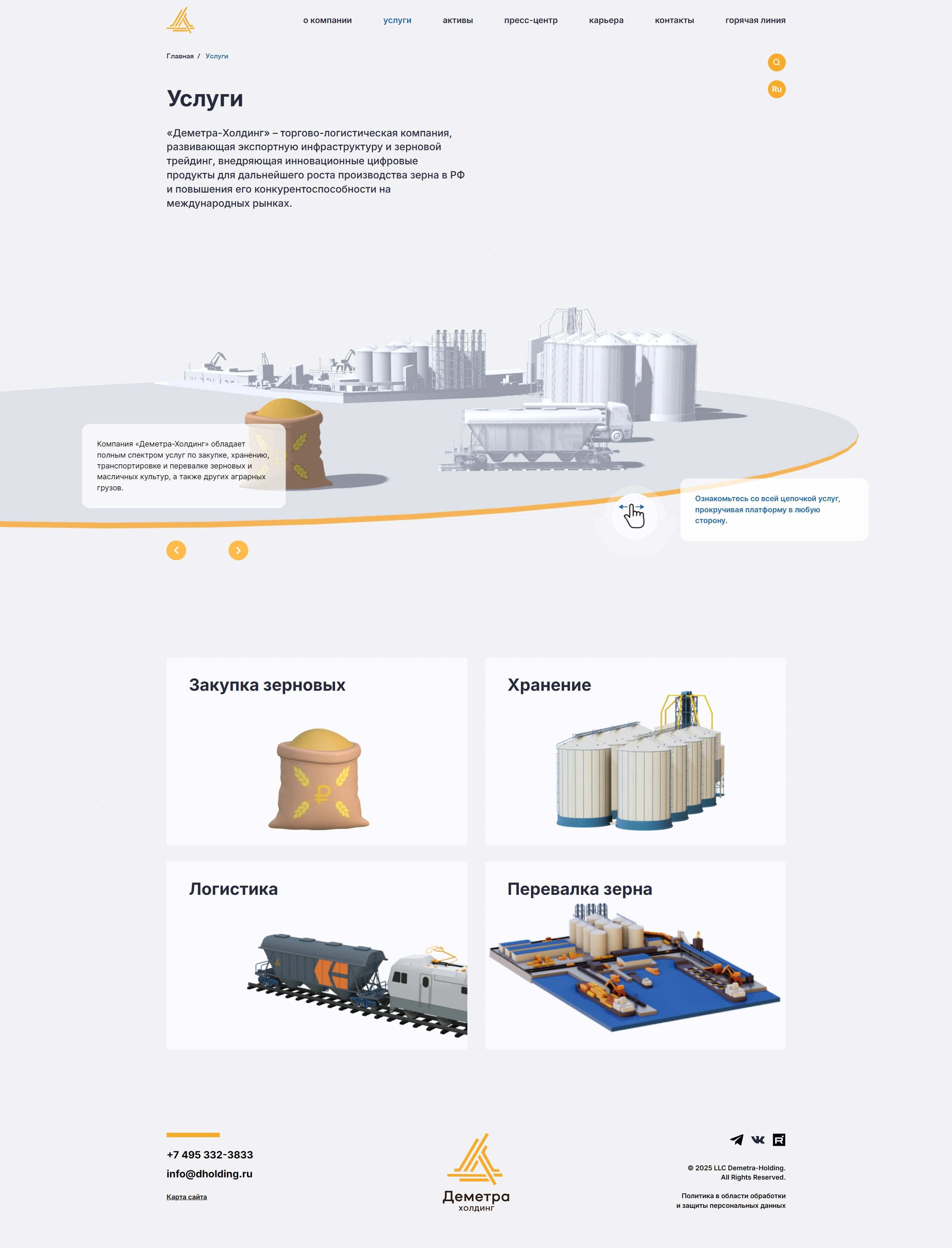 Главная Деметра-Холдинг, тематика — Бизнес и профессиональные услуги, цвета — Белый, Серый, Оранжевый, стиль — Корпоративный, Минимализм, типографика — Без засечек