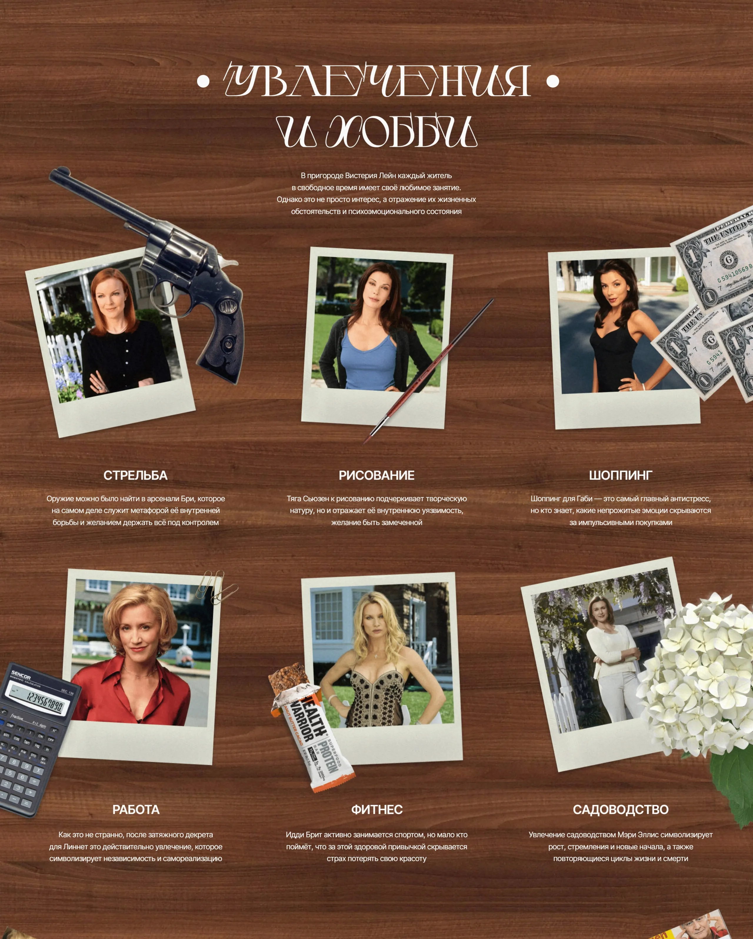 Креативный сайт, посвященный всемирно известному и любимому сериалу о женщинах из американского пригорода, где царствуют обман, шантаж и предательства. Сериал завоевал любовь миллионов зрителей по всему миру.
