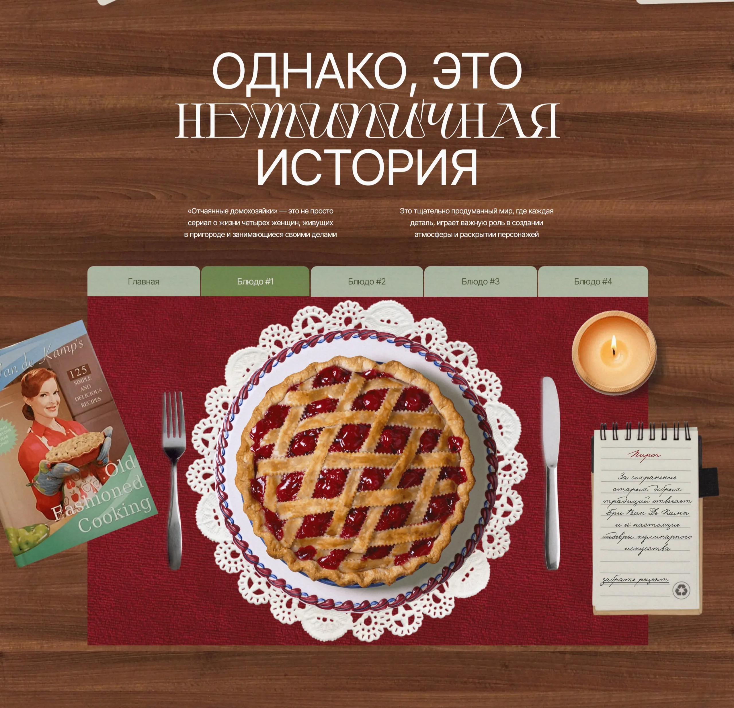 Креативный сайт, посвященный всемирно известному и любимому сериалу о четырех домохозяйках из американского пригорода, где царствуют обман, шантаж и неожиданные повороты судьбы.