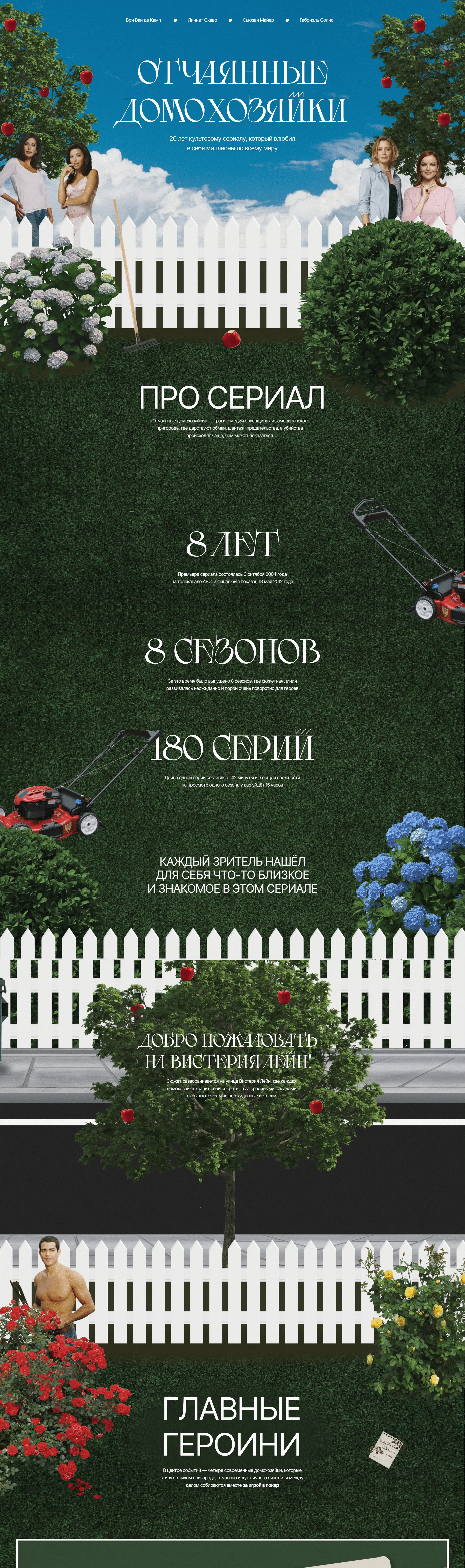 Площадка посвящена культовому сериалу о жизни женщин в американском пригороде, где внутренние конфликты, секреты и неожиданные повороты сюжета переплетаются в трагикомедийном формате.