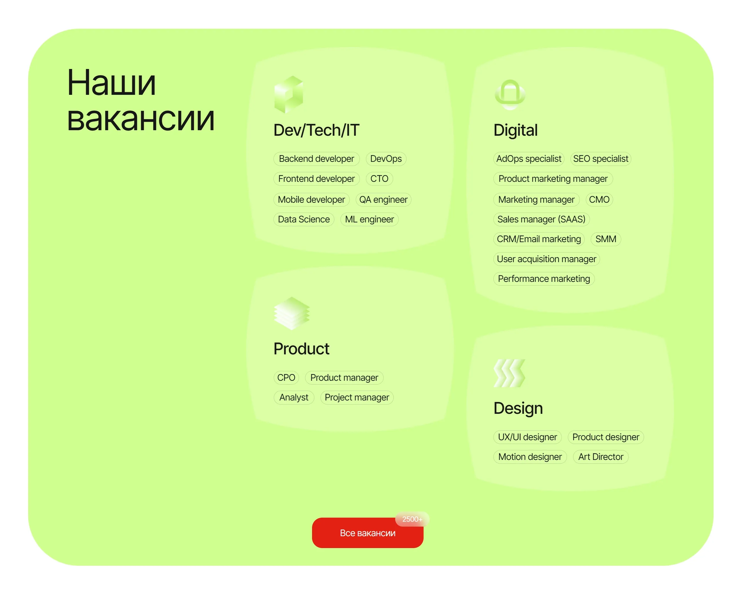 Компания предоставляет услуги по поиску редких и квалифицированных специалистов в различных областях, включая разработку, дизайн и маркетинг. Также она предлагает HR-консалтинг и исследование кадрового рынка для бизнеса.