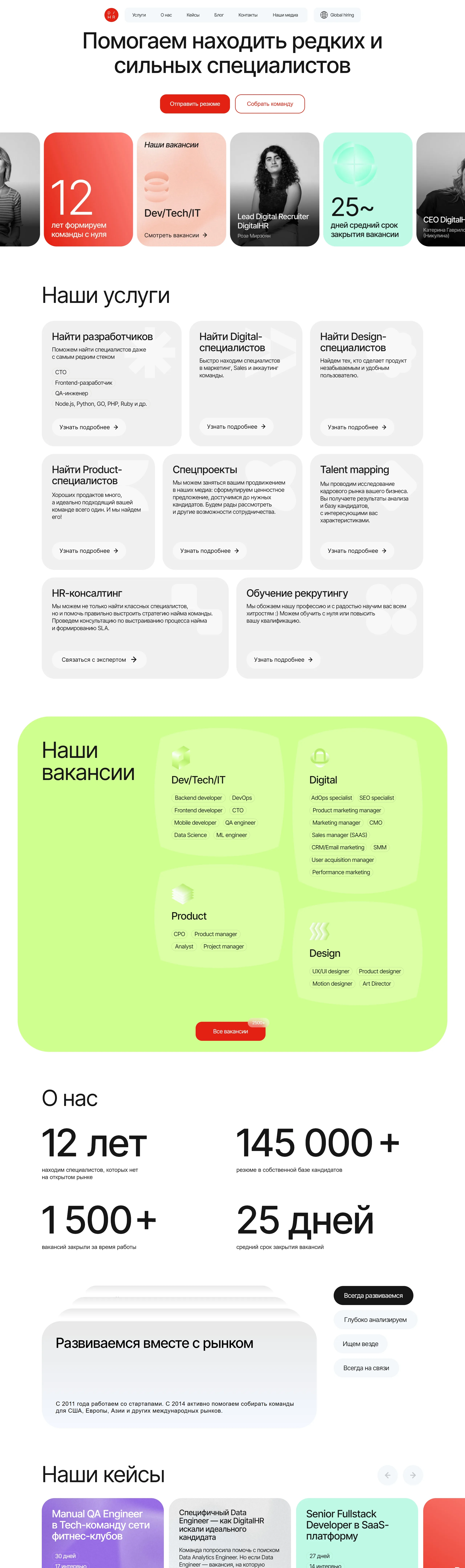 Компания специализируется на поиске редких и высококвалифицированных специалистов в различных областях, включая разработку, дизайн и маркетинг, а также предлагает услуги по HR-консалтингу и анализу кадрового рынка.