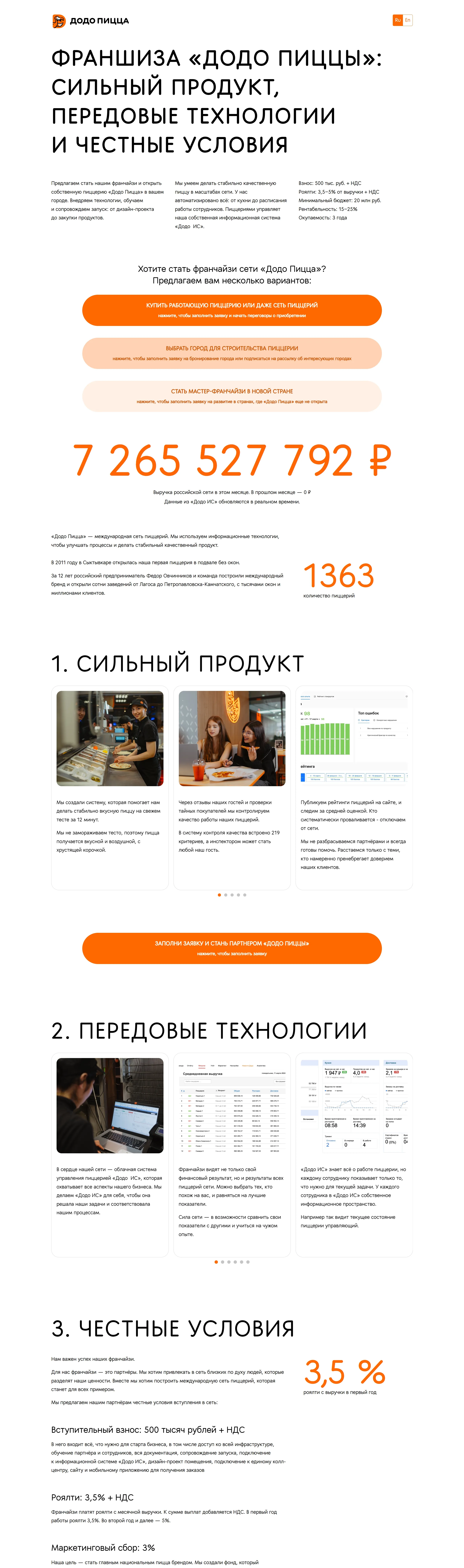 Лендинг Dodo Pizza, тематика — Еда и напитки, цвета — Белый, стиль — Корпоративный, типографика — Без засечек