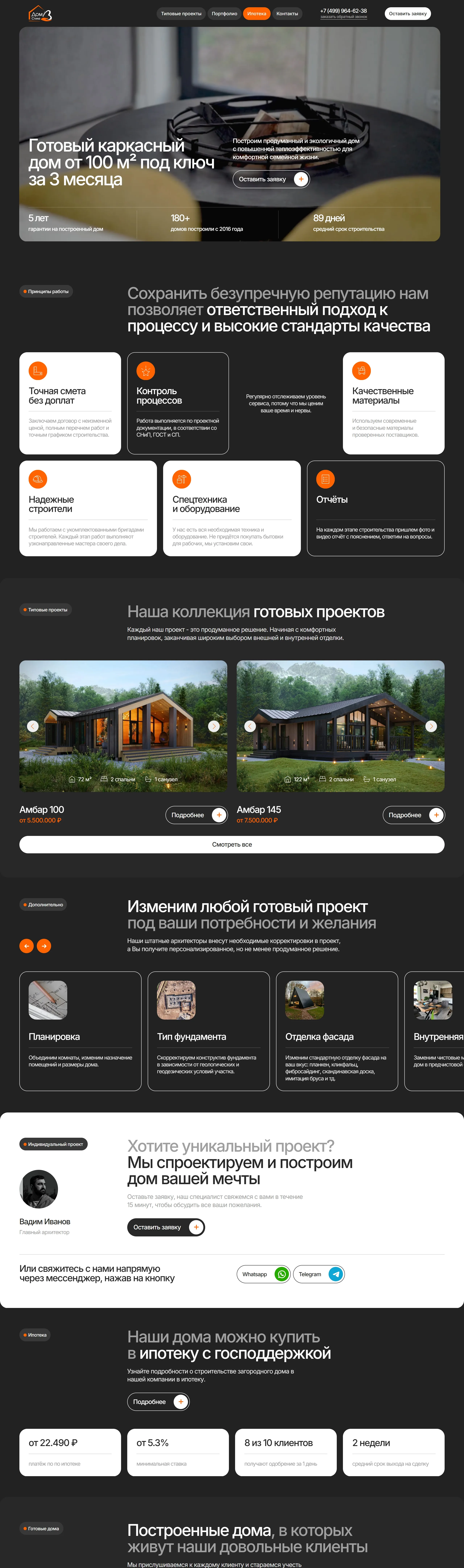 Компания предлагает услуги по строительству каркасных домов с высокой теплоэффективностью, обеспечивая комфортную семейную жизнь в готовых домах площадью от 100 м² за три месяца.
