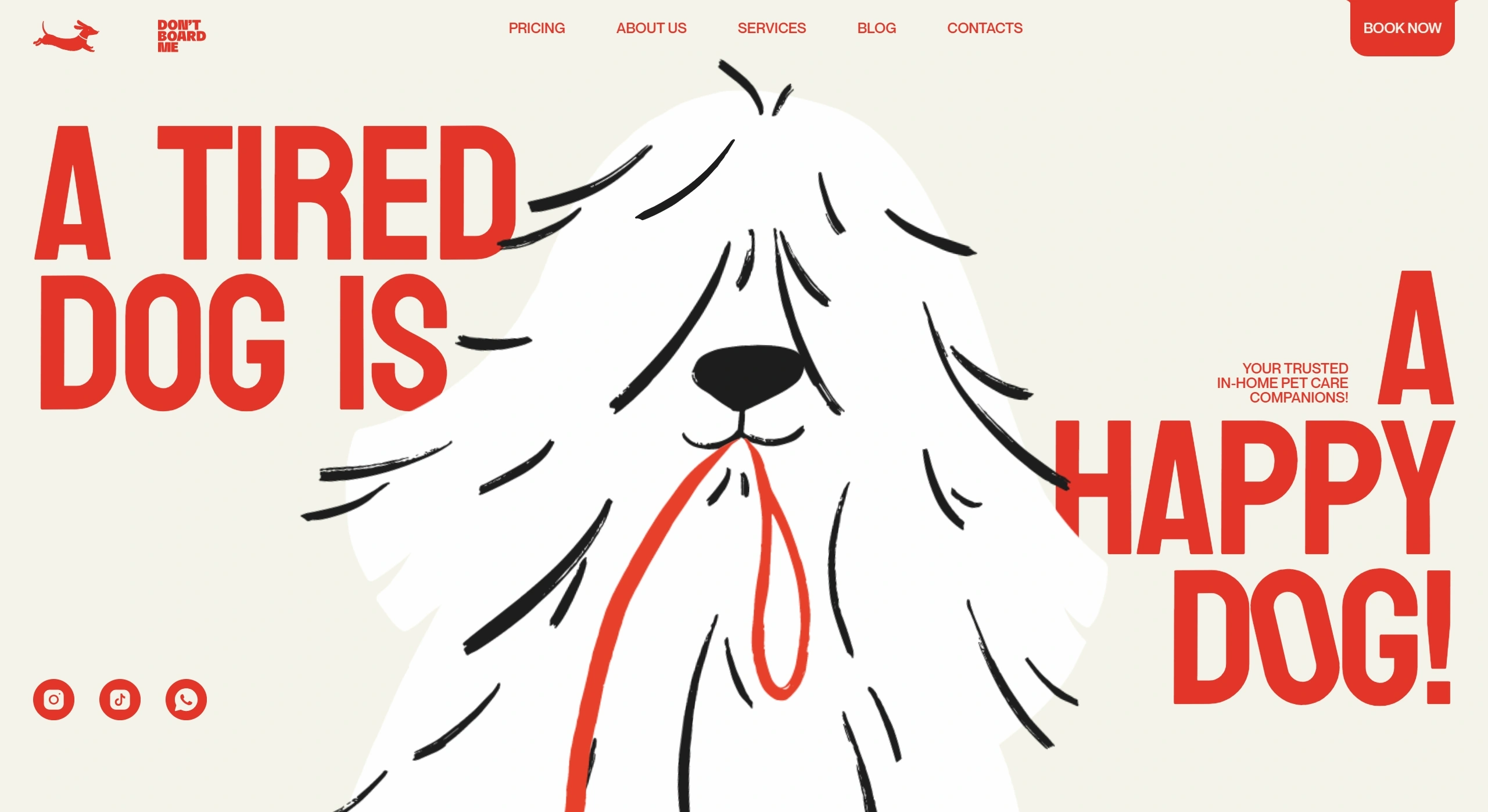 Секция «Первый экран» с сайта https://dontboardme.com/, тематика — Домашние животные, цвета — Белый, Розовый, стиль — Рисованный, Минимализм, типографика — Декоративные