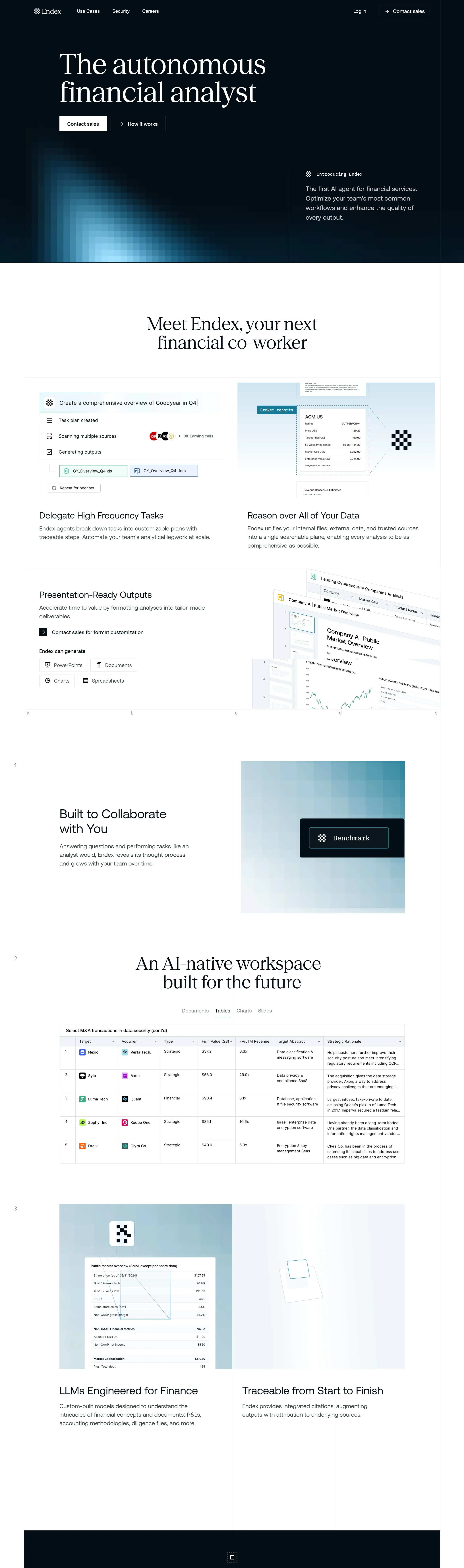 Endex является первым AI-агентом для финансовых услуг, который помогает оптимизировать рабочие процессы команды и повысить качество всех результатов анализа. Он объединяет внутренние файлы, внешние данные и надежные источники, предоставляя возможность осуществлять глубокий анализ на основе актуальной информации.