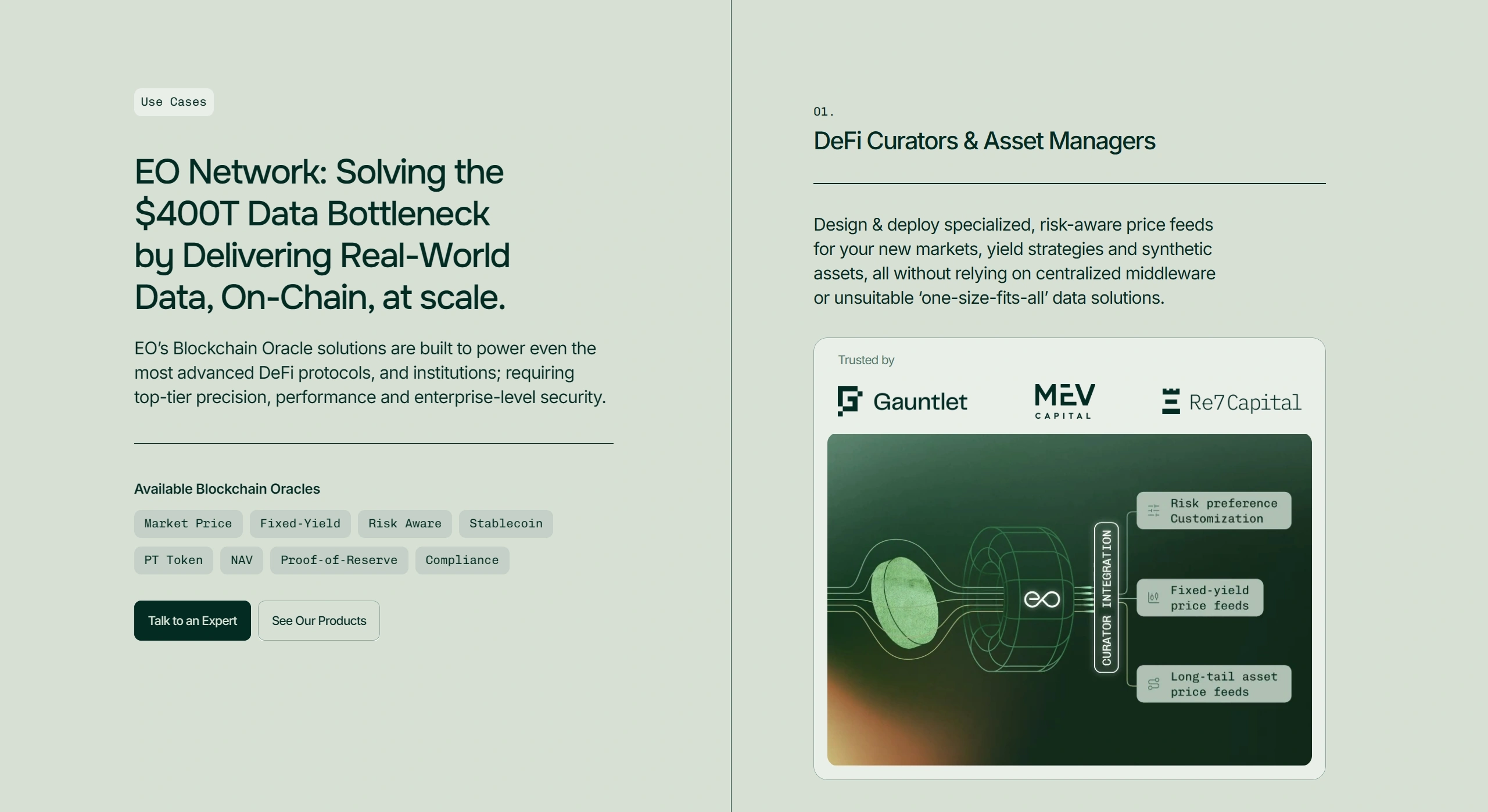 EO Network предоставляет доступ к реальным активам и ликвидности DeFi с помощью децентрализованной сети ораклов-блокчейнов, позволяющей работать с синтетическими активами и реальными активами.