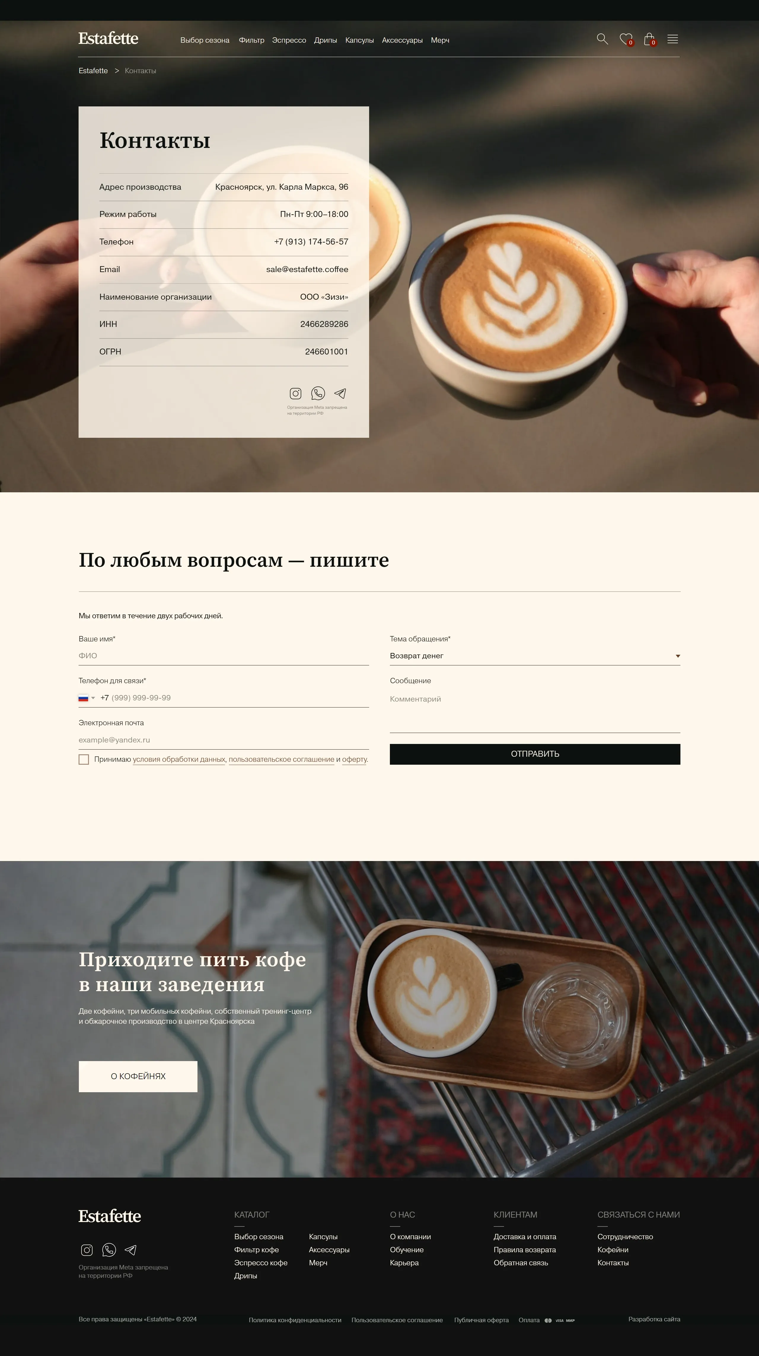Компания предлагает широкий ассортимент кофе и сопутствующих товаров, а также готова помочь своим клиентам через разнообразные каналы связи.