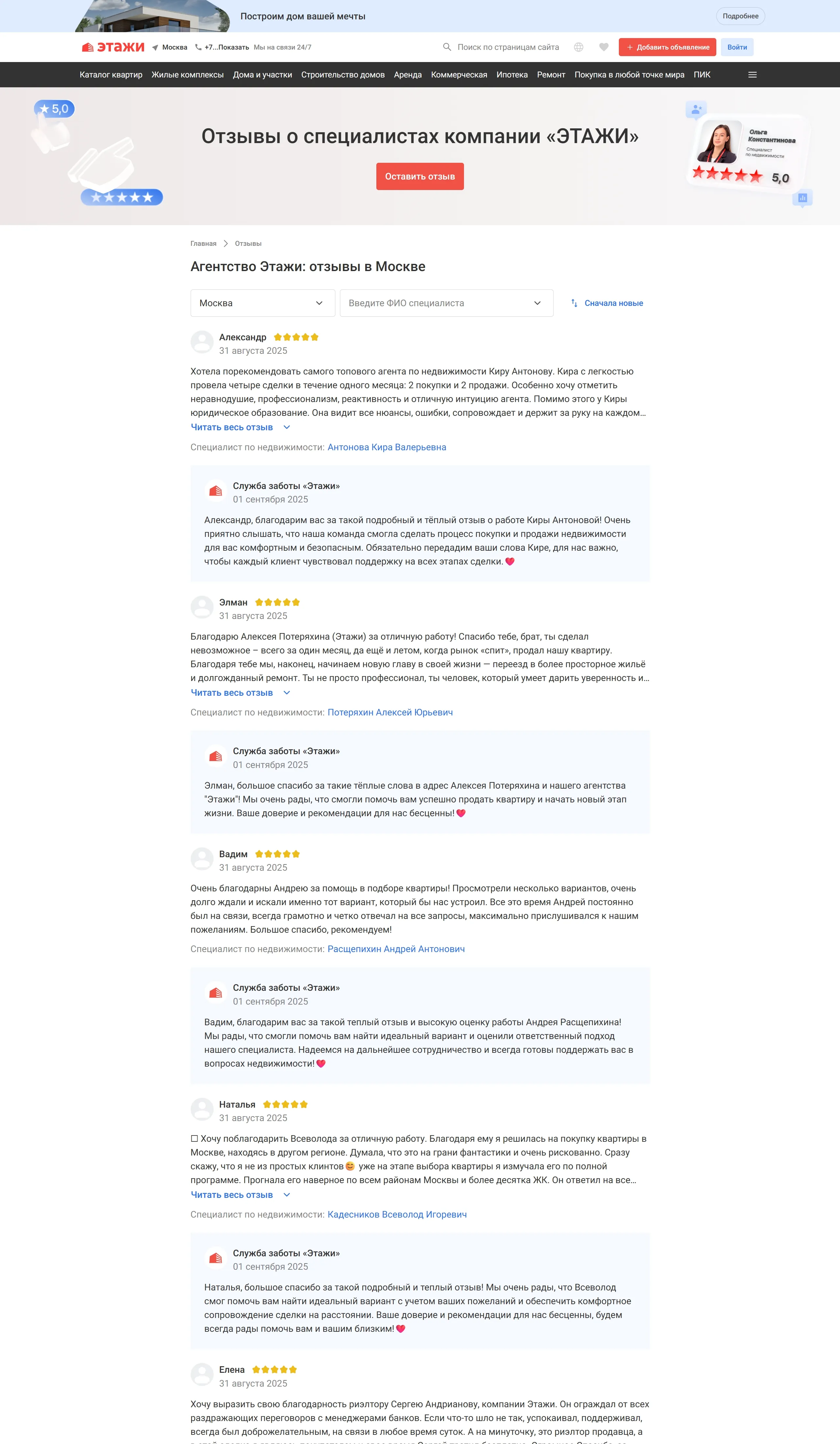 Секция «Отзывы» с сайта https://msk.etagi.com/, тематика — Недвижимость, цвета — Белый, стиль — Корпоративный, типографика — Без засечек