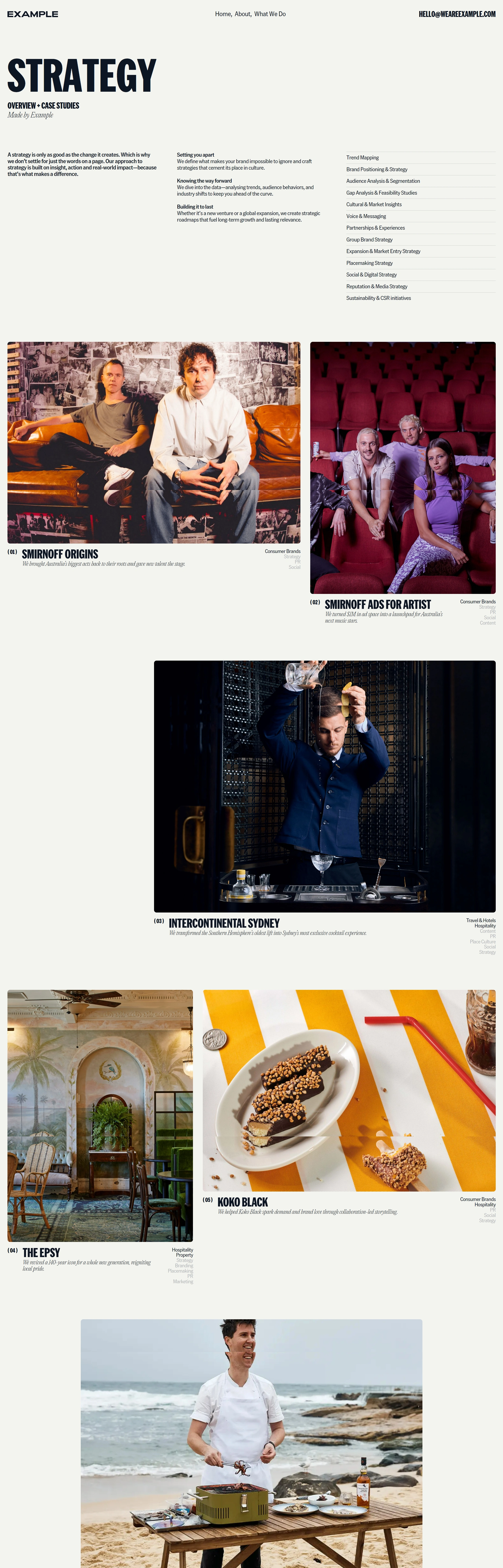 Example является ведущим агентством PR, маркетинга и создания мест в Австралии, которое создает и продвигает самые обсуждаемые бренды, направления и впечатления в мире.